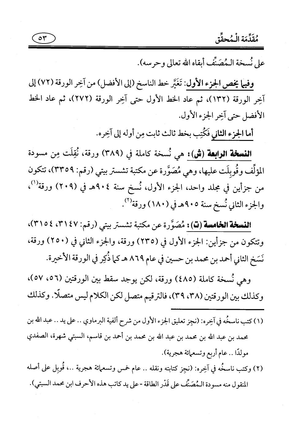 (¬1) كتب ناسخُه في آخِره: (نجِز تعليق الجزء الأول من شرح ألفية البرماوي .. على يد .. عبد الله بن محمد بن عبد الله بن محمد بن عبد الله بن محمد بن أحمد بن قاسم، السبتي شهرة، الصفدي مولدًا .. عام أربع وتسعمائة هجرية).