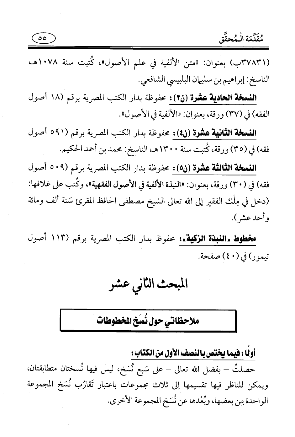 النسخة الحادية عشرة (ق 3): محفوظة بدار الكتب المصرية برقم (18 أصول الفقه) في (37) ورقة، بعنوان: "الألفية في الأصول".
