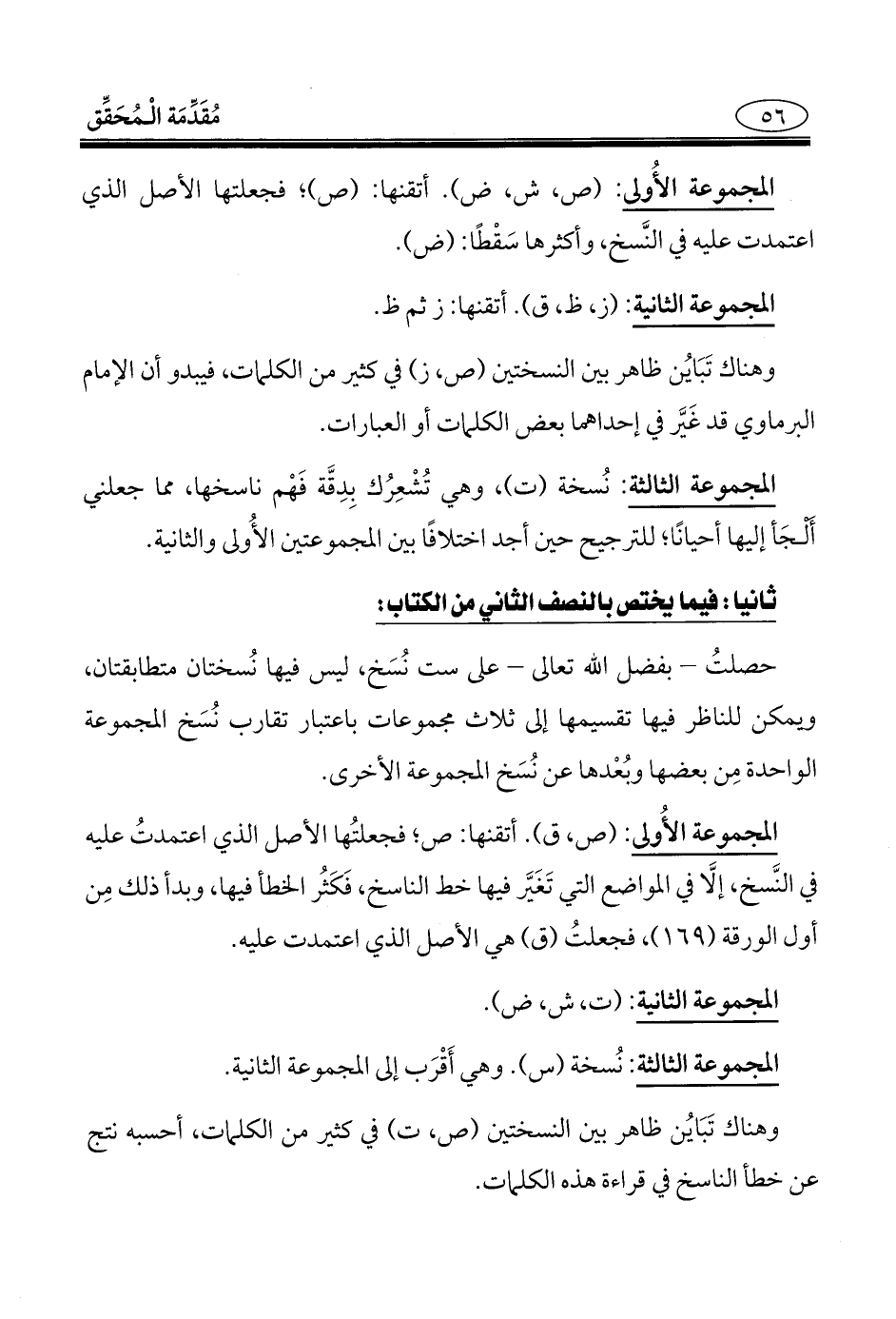 المجموعة الأُولى: (ص، ق). أتقنها: ص؛ فجعلتُها الأصل الذي اعتمدتُ عليه في النَّسخ، إلَّا في المواضع التي تَغَيَّر فيها خط الناسخ، فَكَثُر الخطأ فيها، وبدأ ذلك مِن أول الورقة (169)، فجعلتُ (ق) هي الأصل الذي اعتمدت عليه.