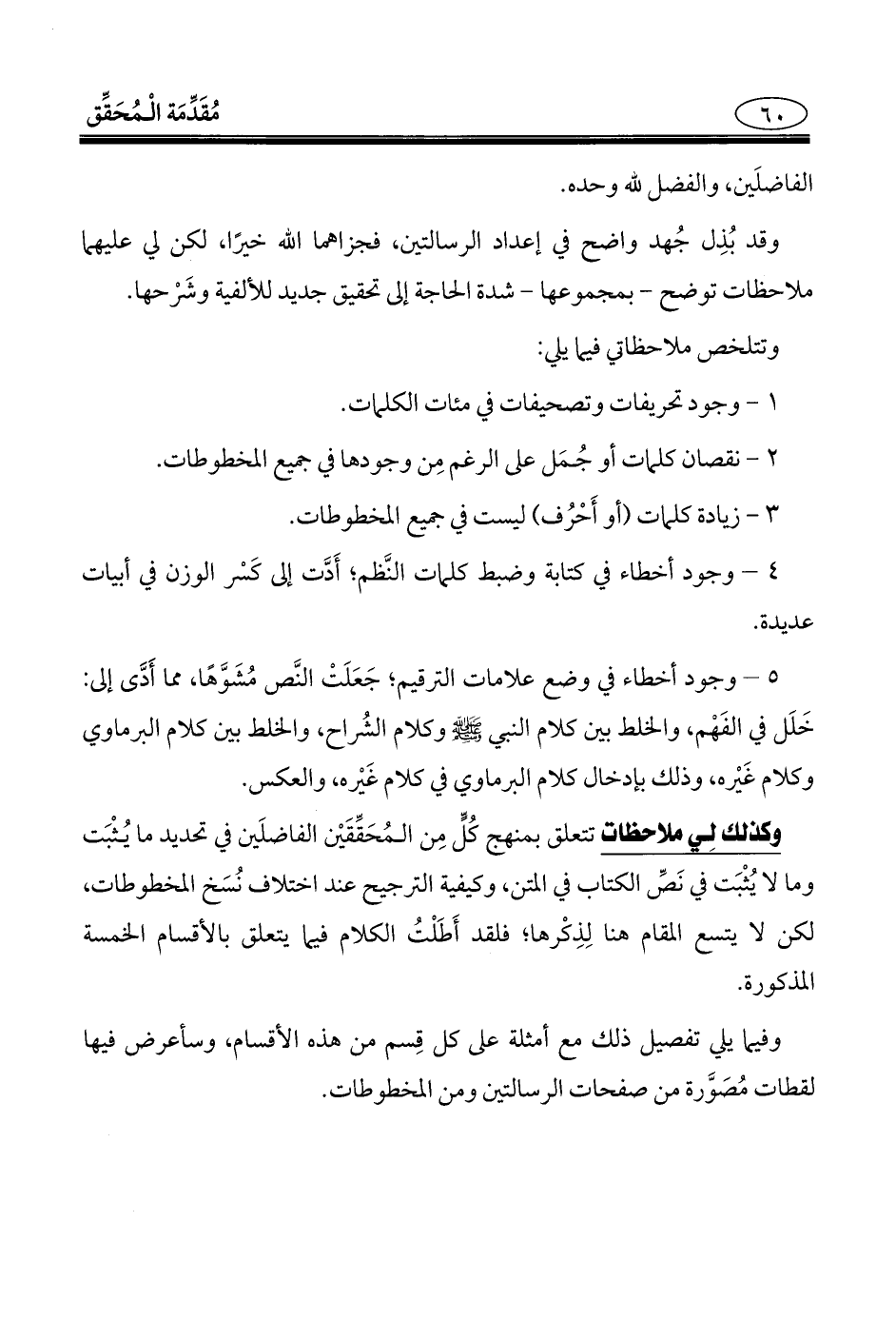 وفيما يلي تفصيل ذلك مع أمثلة على كل قِسم من هذه الأقسام، وسأعرض فيها لقطات مُصَوَّرة من صفحات الرسالتين ومن المخطوطات.