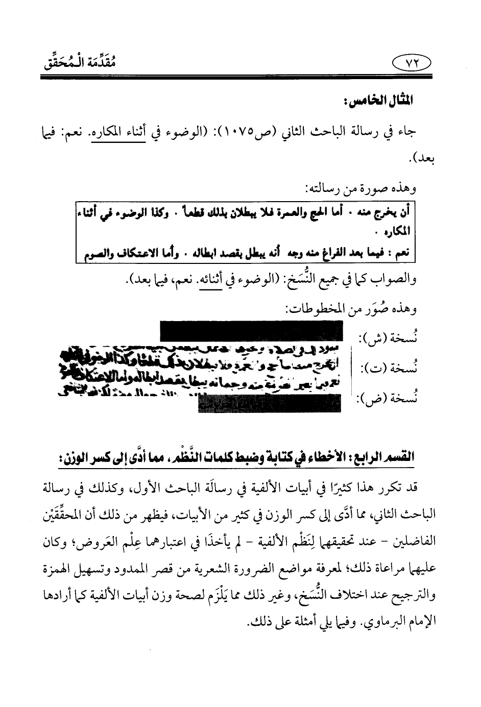 قد تكرر هذا كثيرًا في أبيات الألفية في رسالَة الباحث الأول، وكذلك في رسالة الباحث الثاني، مما أدَّى إلى كسر الوزن في كثير من الأبيات، فيظهر من ذلك أن المحقِّقَيْن الفاضلين - عند تحقيقهما لِنَظْم الألفية - لم يأخذَا في اعتبارهما عِلْم العَروض؛ وكان عليهما مراعاة ذلك؛ لمعرفة مواضع الضرورة الشعرية من قصر الممدود وتسهيل الهمزة والترجيح عند اختلاف النُّسَخ، وغير ذلك مما يَلْزَم لصحة وزن أبيات الألفية كما أرادها الإمام البرماوي. وفيما يلي أمثلة على ذلك.