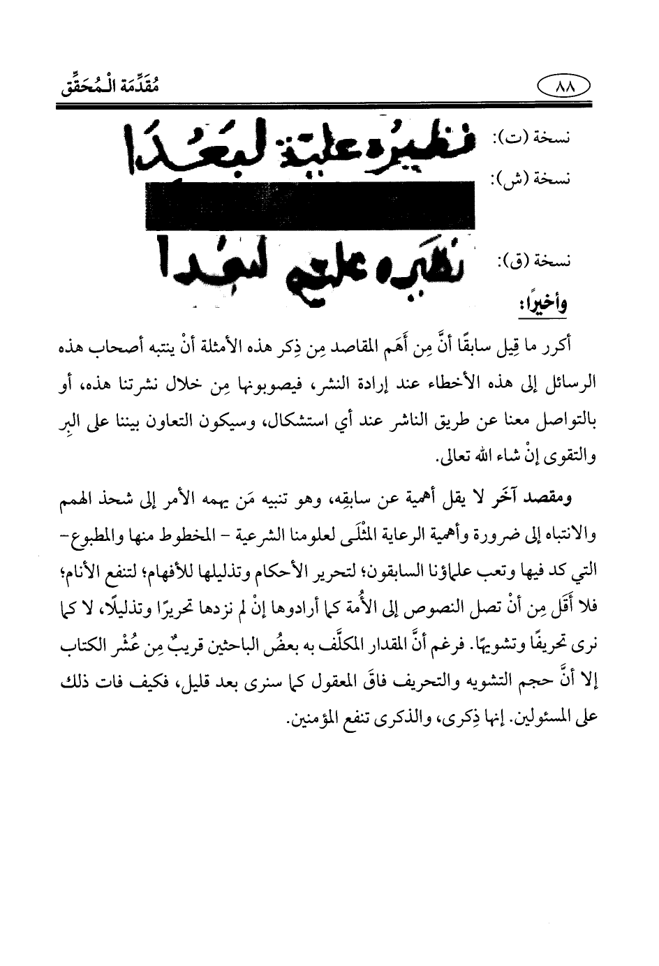 ومقصد آخَر لا يقل أهمية عن سابقِه، وهو تنبيه مَن يهمه الأمر إلى شحذ الهمم والانتباه إلى ضرورة وأهمية الرعاية المثْلَى لعلومنا الشرعية - المخطوط منها والمطبوع - التي كد فيها وتعب علماؤنا السابقون؛ لتحرير الأحكام وتذليلها للأفهام؛ لتنفع الأنام؛ فلا أَقَل مِن أنْ تصل النصوص إلى الأُمة كما أرادوها إنْ لم نزدها تحريرًا وتذليلًا، لا كما نرى تحريفًا وتشويهًا. فرغم أنَّ المقدار المكلَّف به بعضُ الباحثين قريبٌ مِن عُشْر الكتاب إلا أنَّ حجم التشويه والتحريف فاقَ المعقول كما سنرى بعد قليل، فكيف فات ذلك على المسئولين. إنها ذِكرى، والذكرى تنفع المؤمنين.