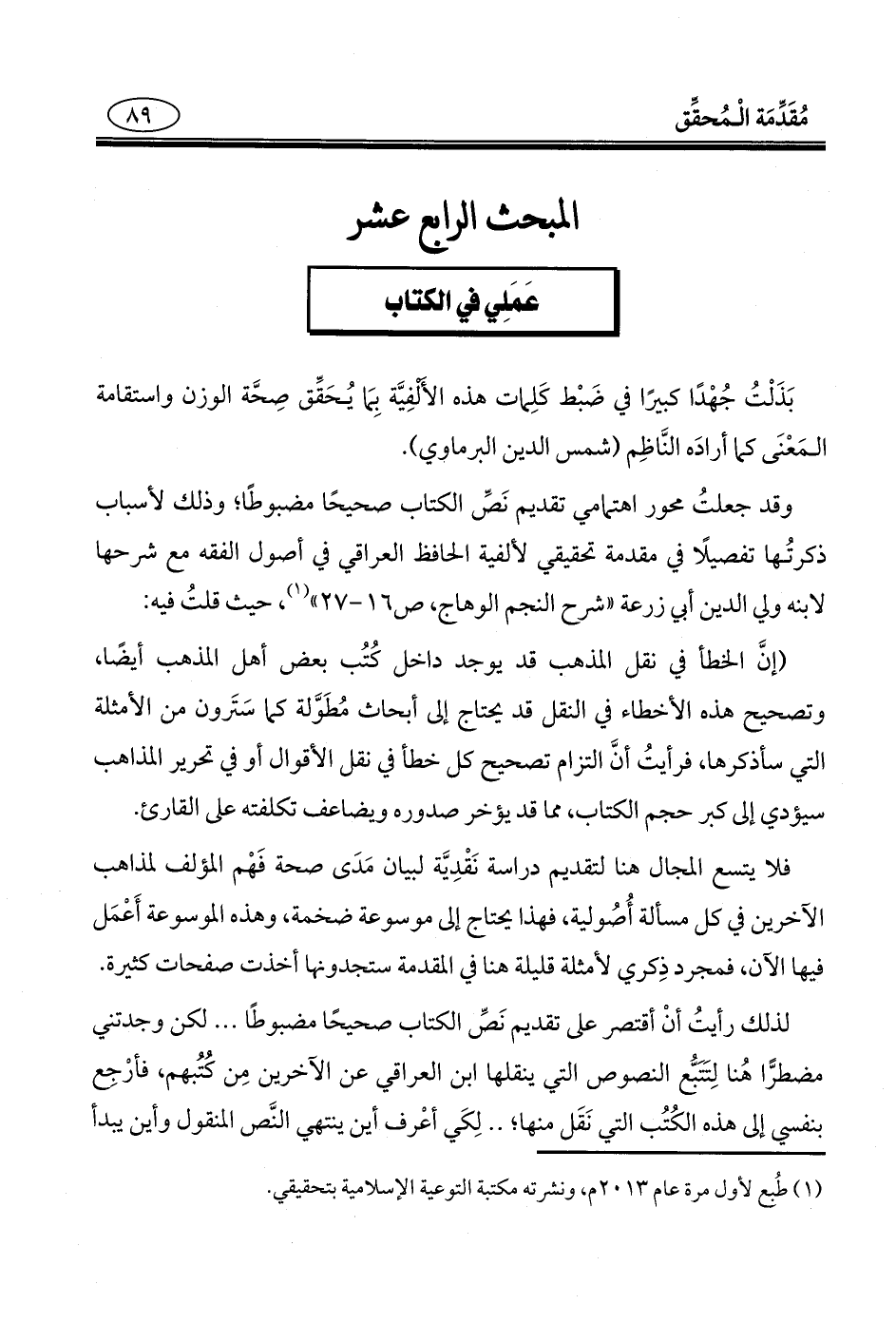 (إنَّ الخطأ في نقل المذهب قد يوجد داخل كُتُب بعض أهل المذهب أيضًا، وتصحيح هذه الأخطاء في النقل قد يحتاج إلى أبحاث مُطَوَّلة كما سَتَرون من الأمثلة التي سأذكرها، فرأيتُ أنَّ التزام تصحيح كل خطأ في نقل الأقوال أو في تحرير المذاهب سيؤدي إلى كبر حجم الكتاب، مما قد يؤخر صدوره ويضاعف تكلفته على القارئ.