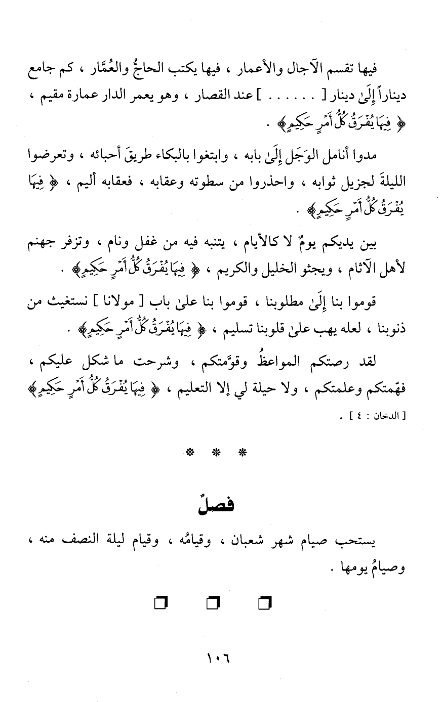 فيها تقسم الآجال والأعمار، فيها يكتب الحاجُّ والعُمَّار، كم جامع ديناراً إِلَى دينار [......] عند القصار، وهو يعمر الدار عمارة مقيم، {فِيهَا يُفْرَقُ كُلُّ أَمْرٍ حَكِيمٍ}.