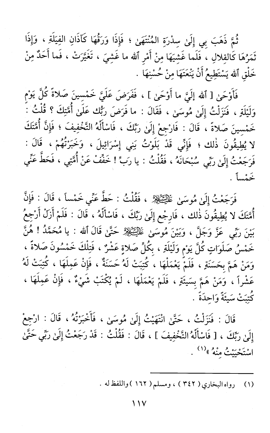 فَرَجَعْتُ إِلَى مُوسَى -عليه السلام-، فَقُلْتُ: حَطَّ عَنِّي خَمْساً، قَالَ: فَإِنَّ أُمَّتَكَ لا يُطِيقُونَ ذلك، فَارِجْع إِلَى رَبِّكَ، فَاسْألهُ، قَالَ: فَلَمْ أَزَلْ أَرْجِعُ بَيْنَ رَبِّي عَزَّ وَجَلَّ، وَبَيْنَ مُوسَى -عليه السلام- حَتَّى قَالَ الله: يا مُحَمَّدُ! هُنَّ خَمْسُ صَلَوَاتٍ كُلَّ يَوْمٍ وَلَيْلَةٍ، بِكُلِّ صَلاةٍ عَشْرٌ، فَتِلْكَ خَمْسُونَ صَلاةً، وَمَنْ هَمَّ بِحَسَنَةٍ، فَلَمْ يَعْمَلْهَا، كُتِبَتْ لَهُ حَسَنَةٌ، فَإِنْ عَمِلَهَا، كُتِبَتْ لَهُ عَشْراً، وَمَنْ هَمَّ بِسَيئَةٍ، فَلَمْ يَعْمَلْهَا، لَمْ يُكْتَبْ شَيْءٌ، فَإِنْ عَمِلَهَا، كُتِبَتْ سَيئَةً وَاحِدَةً.
