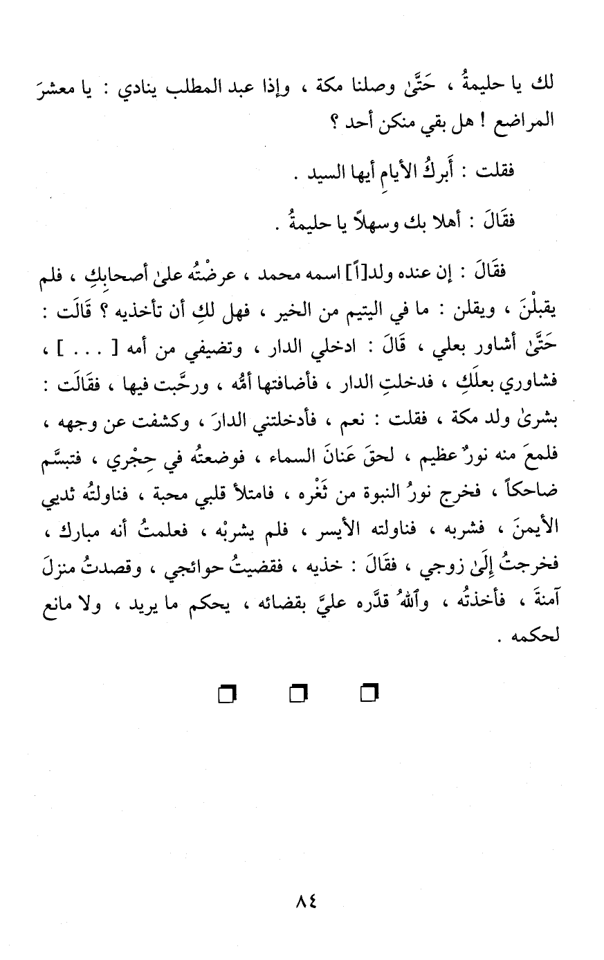 فقَالَ: إن عنده ولد [اً] اسمه محمد، عرضْتُه على أصحابِكِ، فلم يقبلْنَ، ويقلن: ما في اليتيم من الخير، فهل لكِ أن تأخذيه؟ قَالَت: حَتَّى أشاور بعلي، قَالَ: ادخلي الدار، وتضيفي من أمه [...]، فشاوري بعلَكِ، فدخلتِ الدار، فأضافتها أمُّه، ورحَّبت فيها، فقَالَت: بشرى ولد مكة، فقلت: نعم، فأدخلتني الدارَ، وكشفت عن وجهه، فلمعَ منه نورٌ عظيم، لحقَ عَنانَ السماء، فوضعتُه في حِجْري، فتبسَّم ضاحكاً، فخرج نورُ النبوة من ثَغْره، فامتلأ قلبي محبة، فناولتُه ثديى الأيمنَ، فشربه، فناولته الأيسر، فلم يشربْه، فعلمتُ أنه مبارك، فخرجتُ إِلَى زوجي، فقَالَ: خذيه، فقضيتُ حوائجي، وقصدتُ منزلَ آمنةَ، فأخذتُه، واللهُ قدَّره عليَّ بقضائه، يحكم ما يريد، ولا مانع لحكمه.