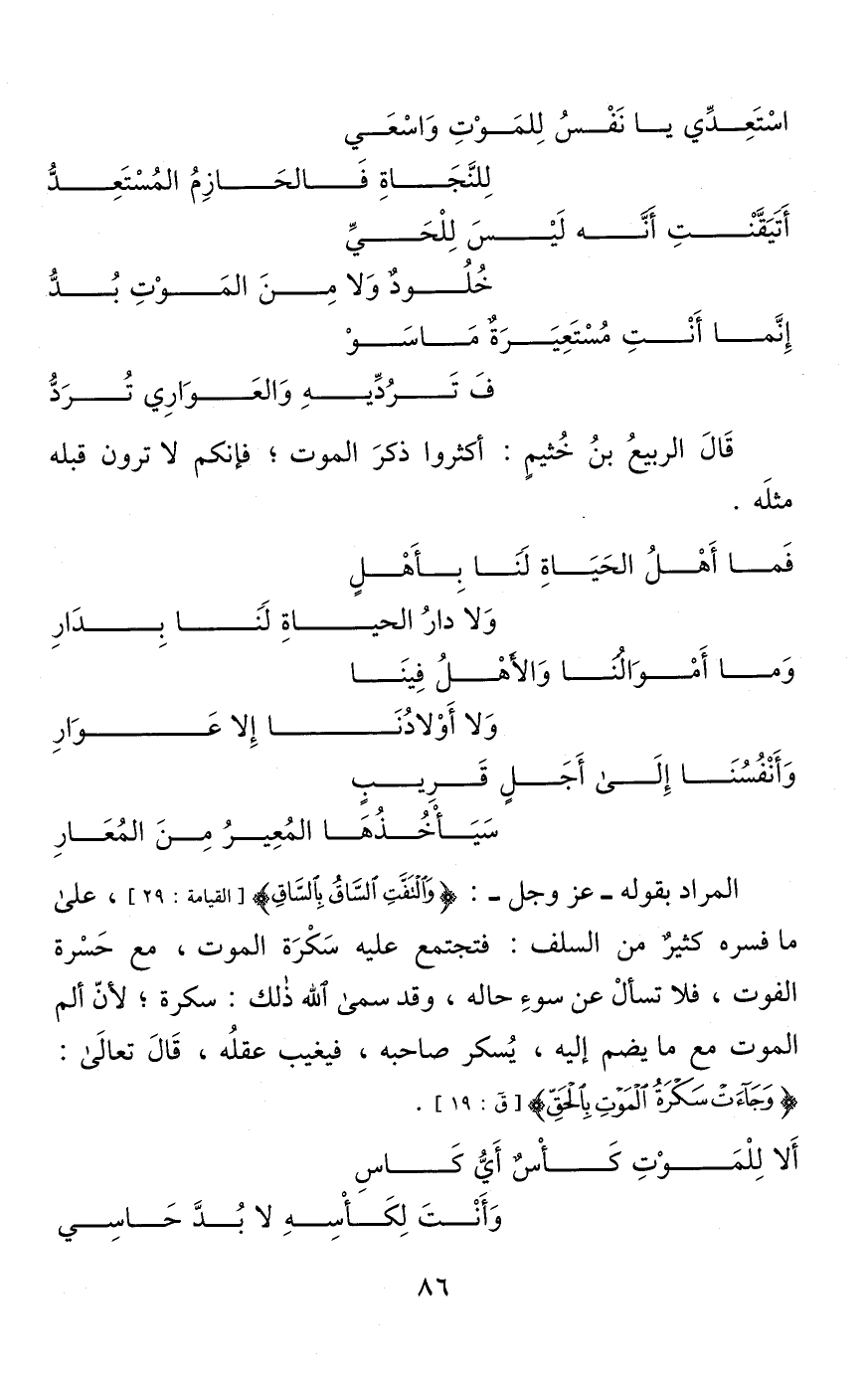 اسْتَعِدِّي يا نَفْسُ لِلمَوْتِ وَاسْعَي ... لِلنَّجَاةِ فَالحَازِمُ المُسْتَعِدُّ