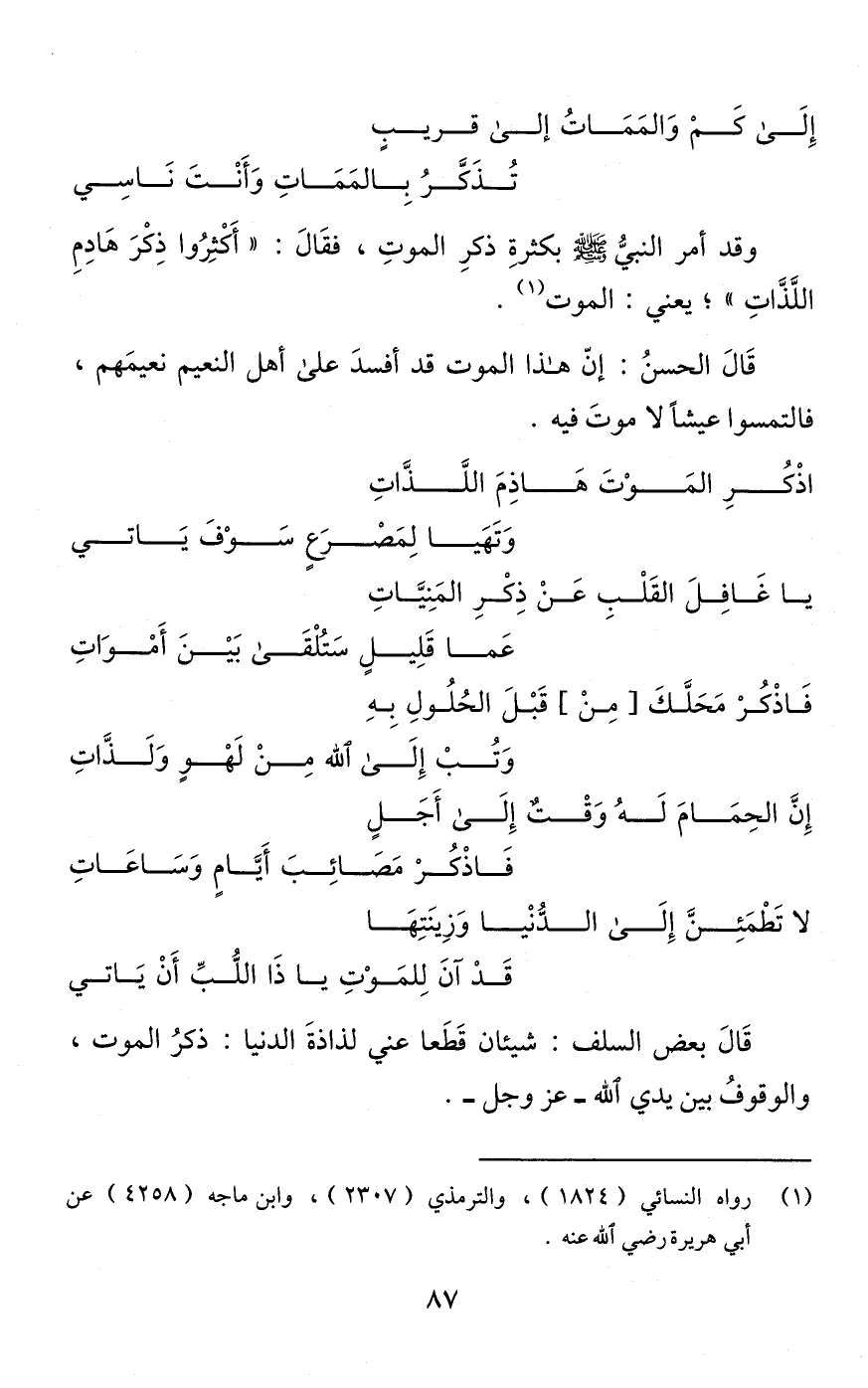 اذْكُرِ المَوْتَ هَاذِمَ اللَّذَّاتِ ... وَتَهَيا لِمَصْرَعٍ سَوْفَ يَاتي