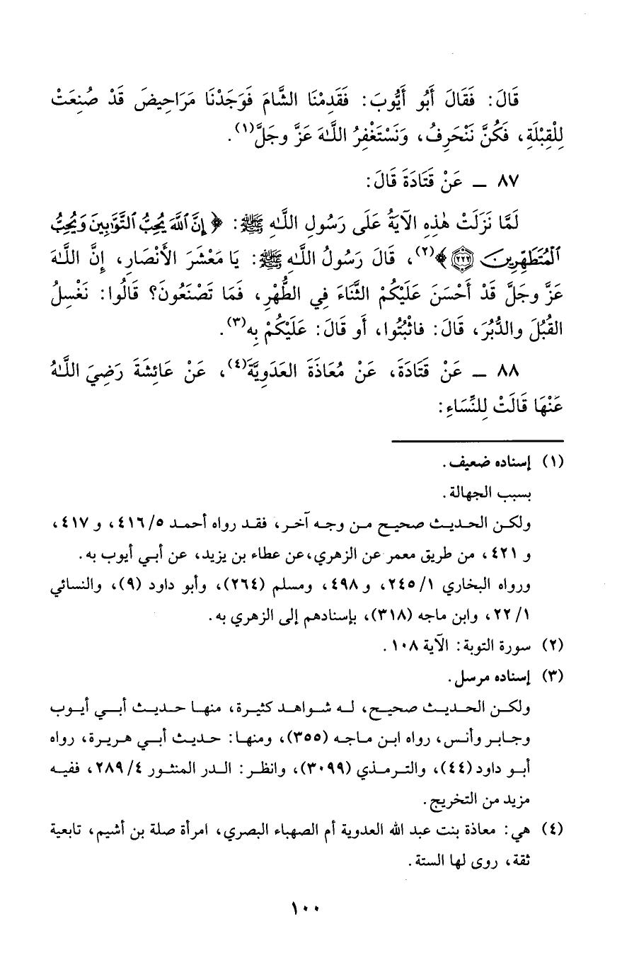 87 - عن قتادة قال لما نزلت هذه الآية عَلَى رَسُولِ اللَّهِ صَلَّى اللَّهُ عَلَيْهِ وَسَلَّمَ: إن الله يحب التوابين ويحب المتطهرين، قَالَ رَسُولُ اللَّهِ صَلَّى اللَّهُ عَلَيْهِ وَسَلَّمَ يا معشر الأنصار إن الله عز وجل قد أحسن عليكم الثناء في الطهر فما تصنعون قالوا نغسل القبل والدبر قال فاثبتوا أو قال عليكم به.