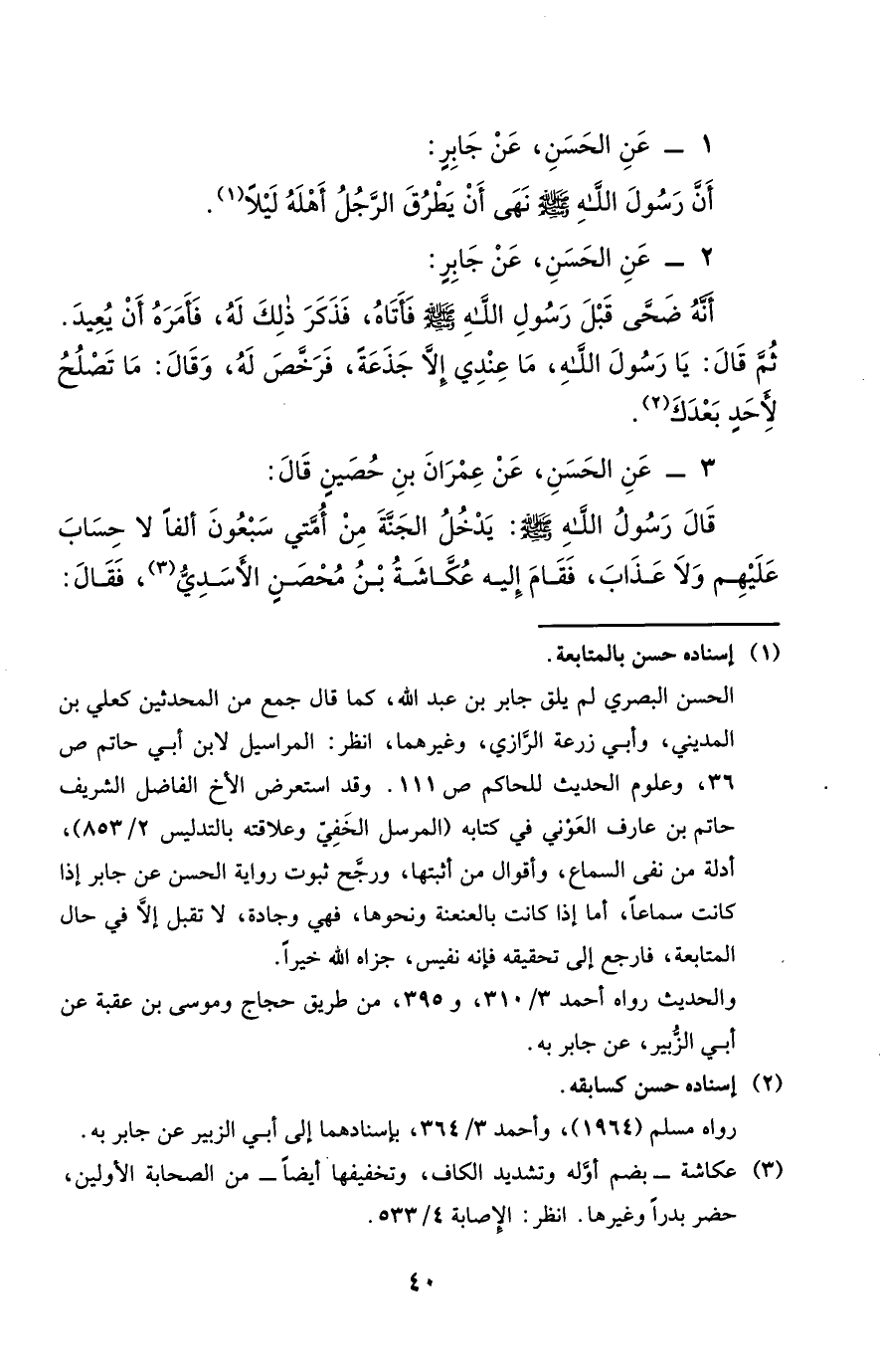 3 - عَنِ الْحَسَنِ عَنْ عِمْرَانَ بْنِ حُصَيْنٍ قَالَ قَالَ رَسُولُ اللَّهِ صَلَّى اللَّهُ عَلَيْهِ وَسَلَّمَ يَدْخُلُ الْجَنَّةَ مِنْ أُمَّتِي سَبْعُونَ أَلْفًا لا حِسَابَ عَلَيْهِمْ وَلا عَذَابَ فَقَامَ إِلَيْهِ عُكَّاشَةُ بْنُ مِحْصَنٍ الأَسَدِيُّ فَقَالَ -[41]- ادْعُ اللَّهَ أَنْ يَجْعَلَنِي مِنْهُمْ فَقَالَ أَنْتَ مِنْهُمْ فَقَامَ إِلَيْهِ آخَرُ فَقَالَ يَا رَسُولَ اللَّهِ ادْعُ اللَّهَ أَنْ يَجْعَلَنِي مِنْهُمْ فَقَالَ سَبَقَكَ بِهَا عُكَّاشَةُ قَالَ يَا رَسُولَ اللَّهِ وَمَنْ هُمْ قَالَ هم الذين لا يكتوون ولا يسترقون وَلا يَتَطَيَّرُونَ وَعَلَى ربِّهِمْ يَتَوَكَّلُونَ. قَالَ الْحَسَنُ عَاشَ عُكَّاشَةُ بَقِيَّةَ أَجَلِهِ وَهُوَ مُسْتَيْقِنٌ أَنَّهُ يَدْخُلِ الْجَنَّةَ قَالَ مُجَّاعَةُ بَلَغَنِي أَنَّهُ اسْتُشْهِدَ يوم اليمامة.