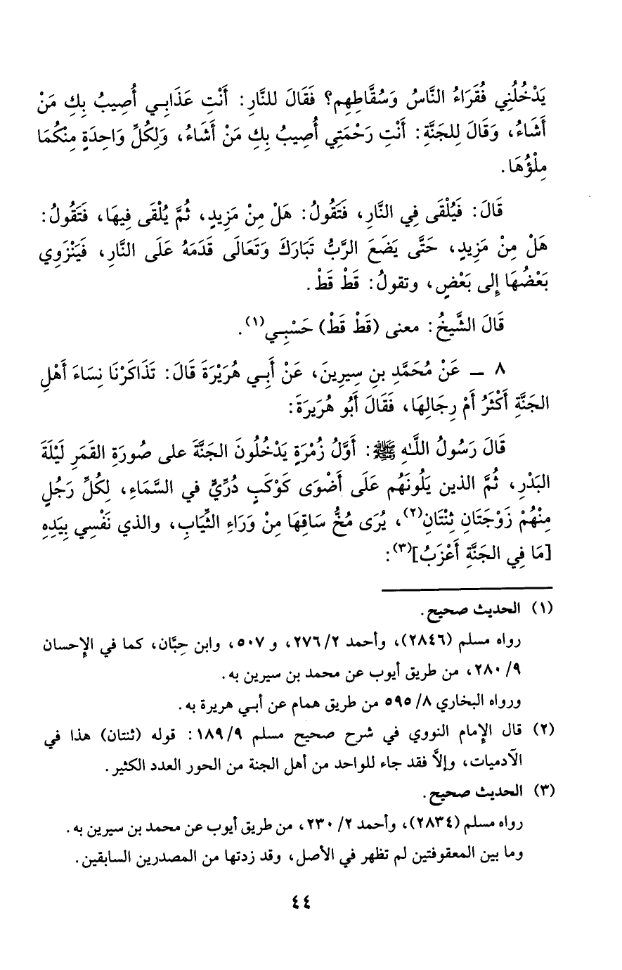 8 - عَنْ مُحَمَّدِ بْنِ سِيرِينَ عَنْ أَبِي هُرَيْرَةَ قَالَ تَذَاكَرْنَا نِسَاءُ أَهْلِ الْجَنَّةِ أَكْثَرُ أَمْ رَجِالُهَا فَقَالَ أَبُو هُرَيْرَةَ قَالَ رَسُولُ اللَّهِ صَلَّى اللَّهُ عَلَيْهِ وَسَلَّمَ أَوَّلُ زُمْرَةٍ يَدْخُلُونَ الْجَنَّةَ عَلَى صُورَةِ الْقَمَرِ لَيْلَةَ الْبَدْرِ ثُمَّ الَّذِينَ يَلُونَهُمْ عَلَى أَضْوَى كَوْكَبٍ دُرِّيٍّ فِي السَّمَاءِ لِكُلِّ رَجُلٍ مِنْهُمْ زَوْجَتَانِ ثِنْتَانِ يُرَى مُخُّ سَاقِهَا مِنْ وَرَاءِ الثِّيَابِ [وَالَّذِي نَفْسِي بِيَدِهِ مَا فِي الْجَنَّةِ أَعْزَبُ].