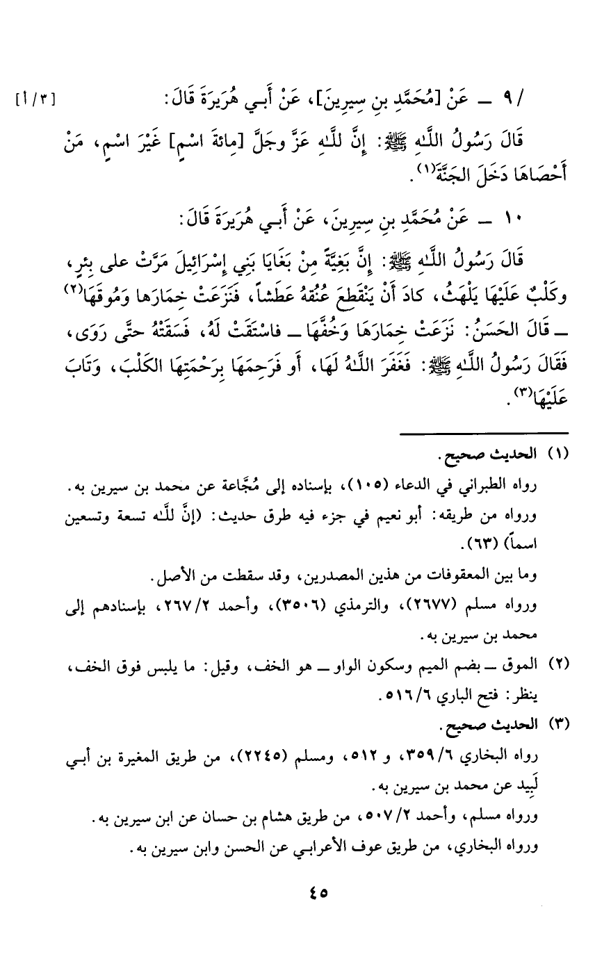 9 - عَنْ مُحَمَّدِ بْنِ سِيرِينَ عَنْ أَبِي هُرَيْرَةَ قَالَ قَالَ رَسُولُ اللَّهِ صَلَّى اللَّهُ عَلَيْهِ وَسَلَّمَ إِنَّ لِلَّهِ عَزَّ وَجَلَّ [مِائَةِ اسْمٍ] غَيْرَ اسْمٍ مَنْ أَحْصَاهَا دَخَلَ الْجَنَّةَ.