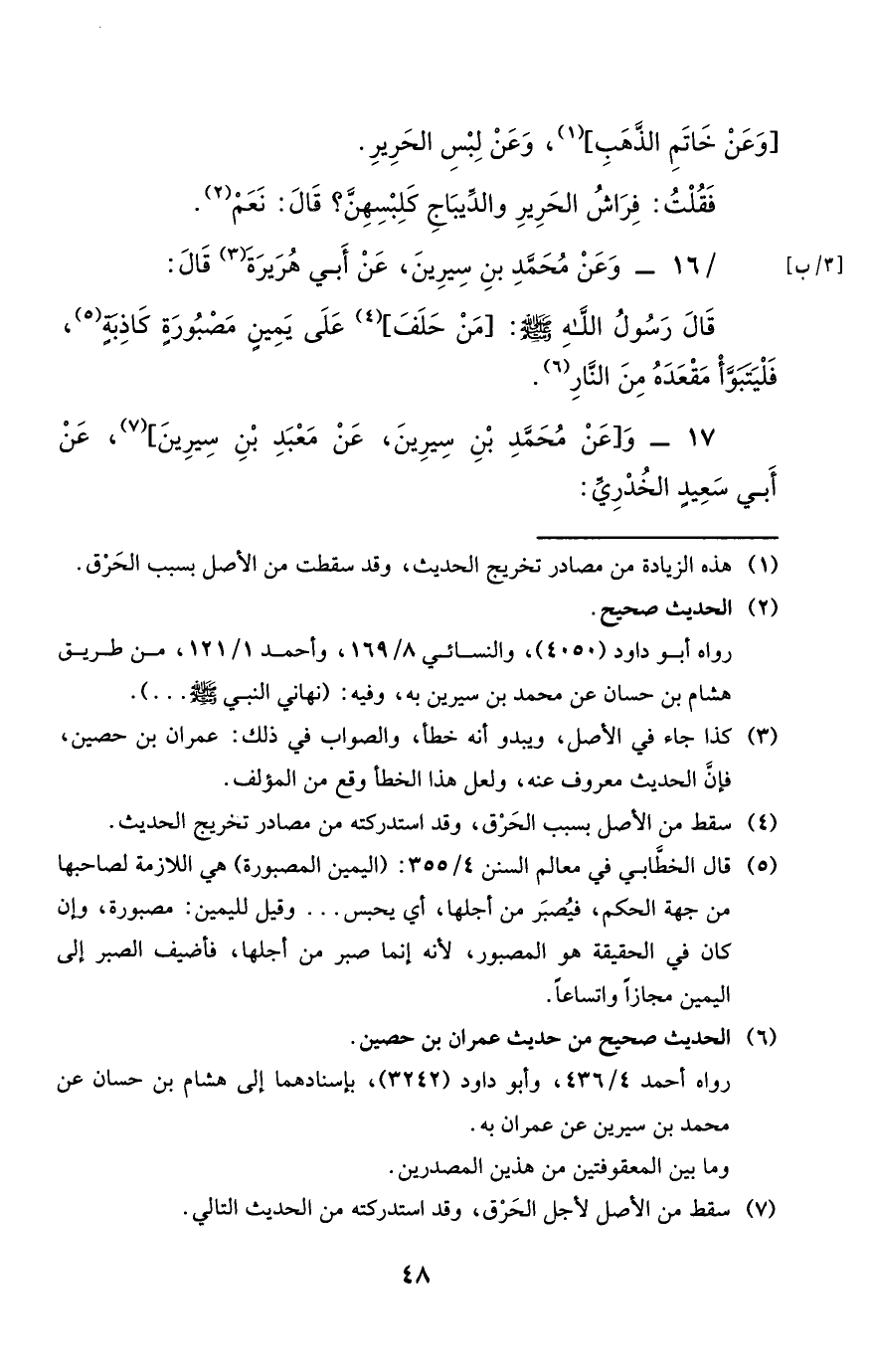 16 - وَعَنْ مُحَمَّدِ بْنِ سِيرِينَ عَنْ أَبِي هُرَيْرَةَ قَالَ قَالَ رَسُولُ اللَّهِ صَلَّى اللَّهُ عَلَيْهِ وَسَلَّمَ [مَنْ حَلَفَ] عَلَى يَمِينٍ مَصْبُورَةٍ كَاذِبَةٍ فليتبوأ مقعده من النار.