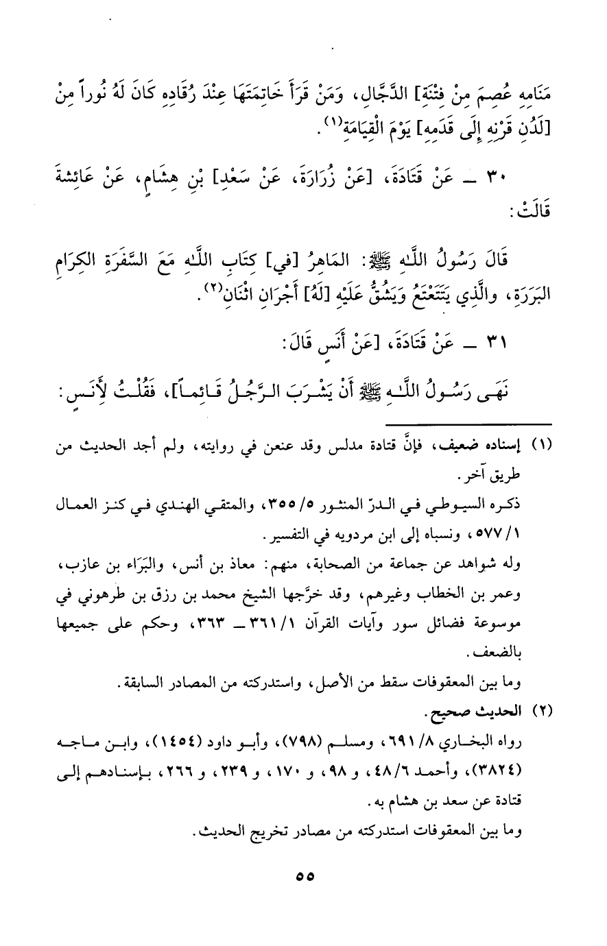 30 - عَنْ قَتَادَةَ [عَنْ زُرَارَةَ عَنْ سَعْدِ] بْنِ هِشَامٍ عَنْ عَائِشَةَ قَالَتْ قَالَ رَسُولُ اللَّهِ صَلَّى اللَّهُ عَلَيْهِ وَسَلَّمَ الْمَاهِرُ [فِي] كِتَابِ اللَّهِ مَعَ السَّفَرَةِ الْكِرَامِ الْبَرَرَةِ وَالَّذِي يَتَتَعْتَعُ وَيَشُقُّ عَلَيْهِ [لَهُ] أَجْرَانِ اثْنَانِ.