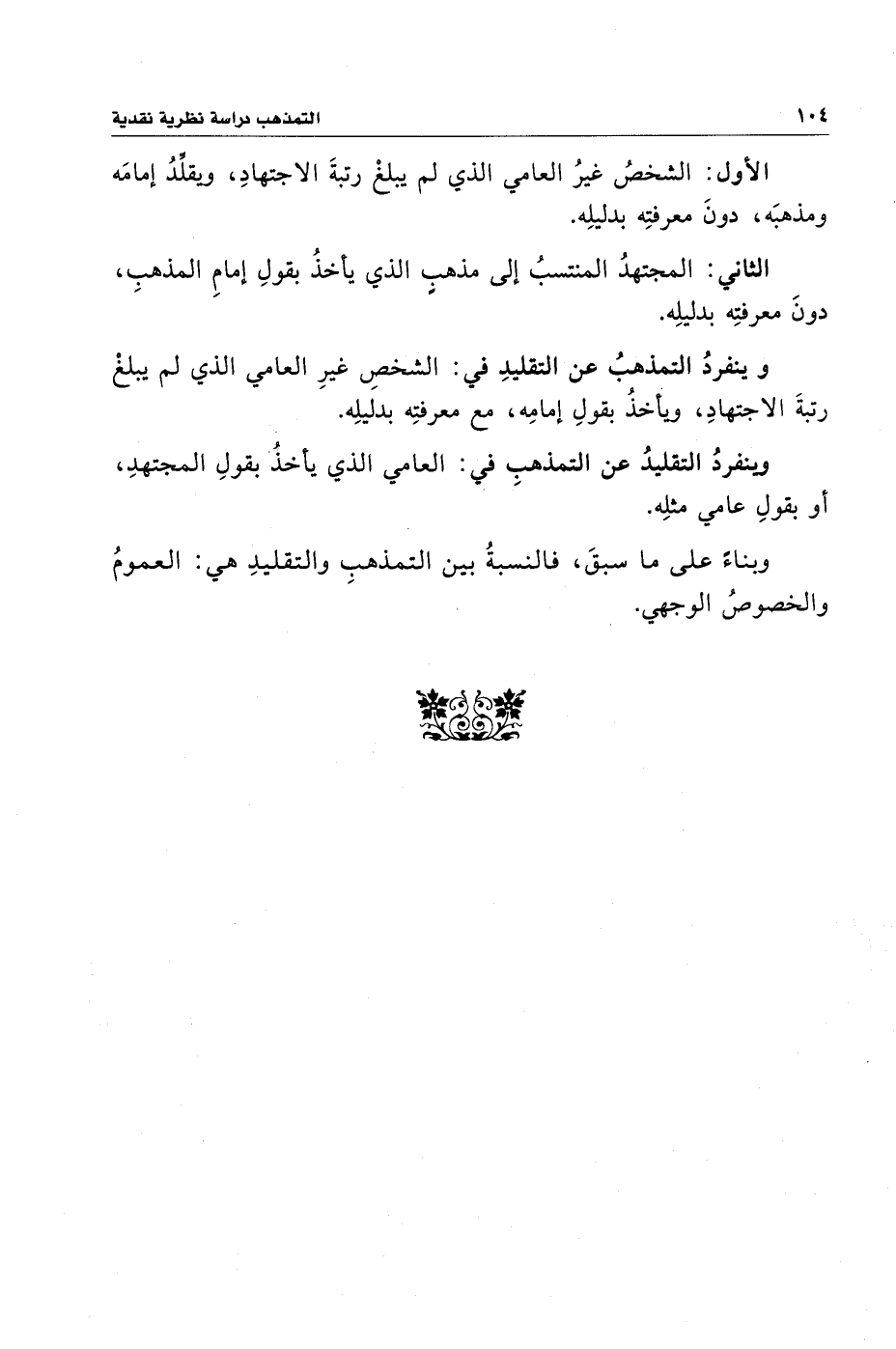 وينفردُ التمذهبُ عن التقليدِ في: الشخصِ غيرِ العامي الذي لم يبلغْ رتبةَ الاجتهادِ، ويأخذُ بقولِ إمامِه، مع معرفتِه بدليلِه.
