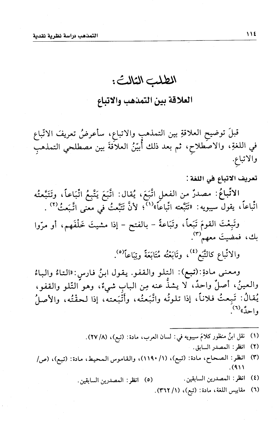 قبلَ توضيحِ العلاقةِ بين التمذهب والاتباعِ، سأعرضُ تعريفَ الاتّباع في اللغةِ، والاصطلاحِ، ثم بعد ذلك أُبيّنُ العلاقةَ بين مصطلحي التمذهبِ والاتباعِ.