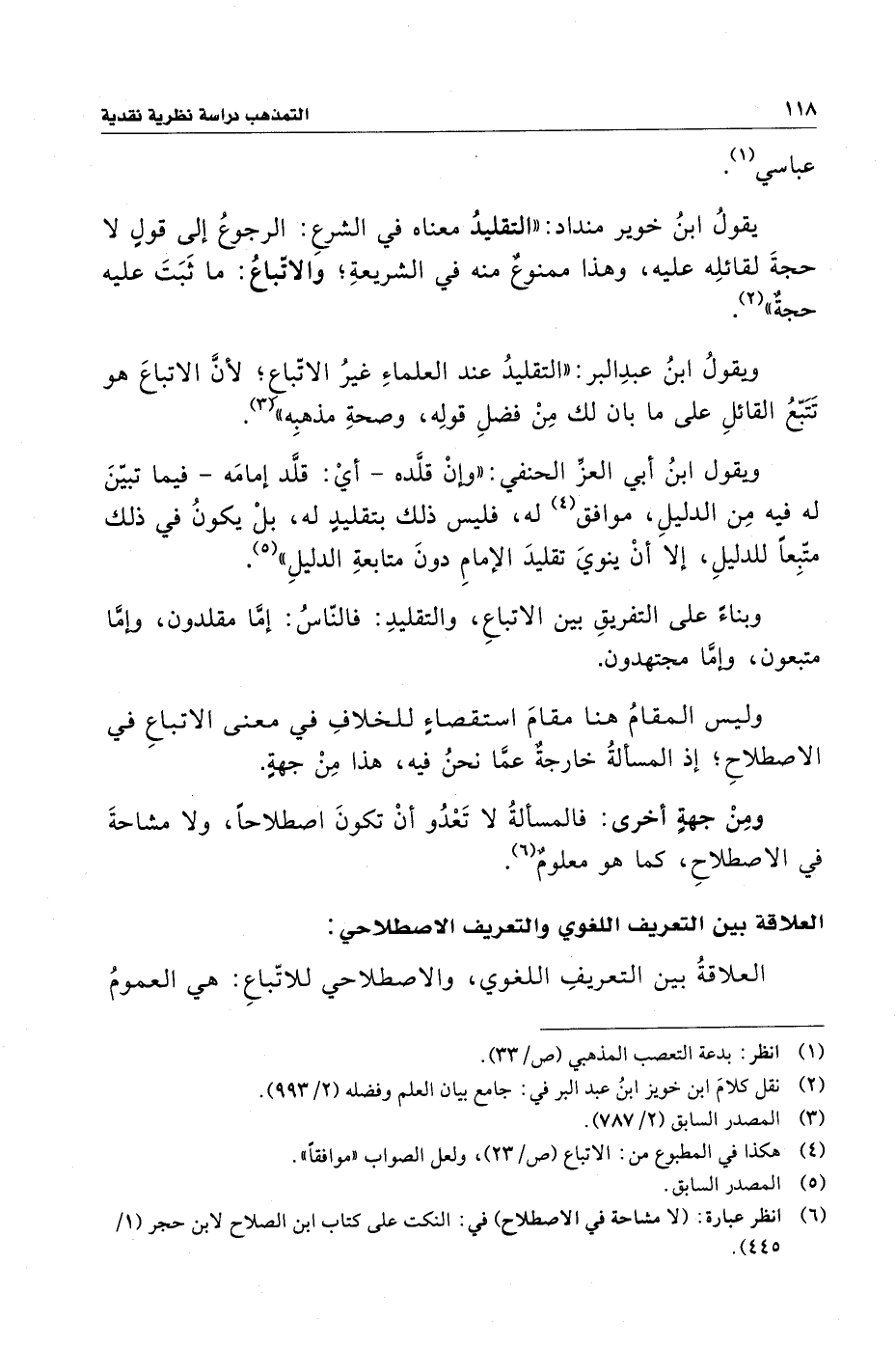 ويقولُ ابنُ عبدِ البر: "التقليدُ عند العلماءِ غيرُ الاتّباعِ؛ لأنَّ الاتباعَ هو تَتَبّعُ القائلِ على ما بان لك مِنْ فضلِ قولِه، وصحةِ مذهبِه" (¬٣).