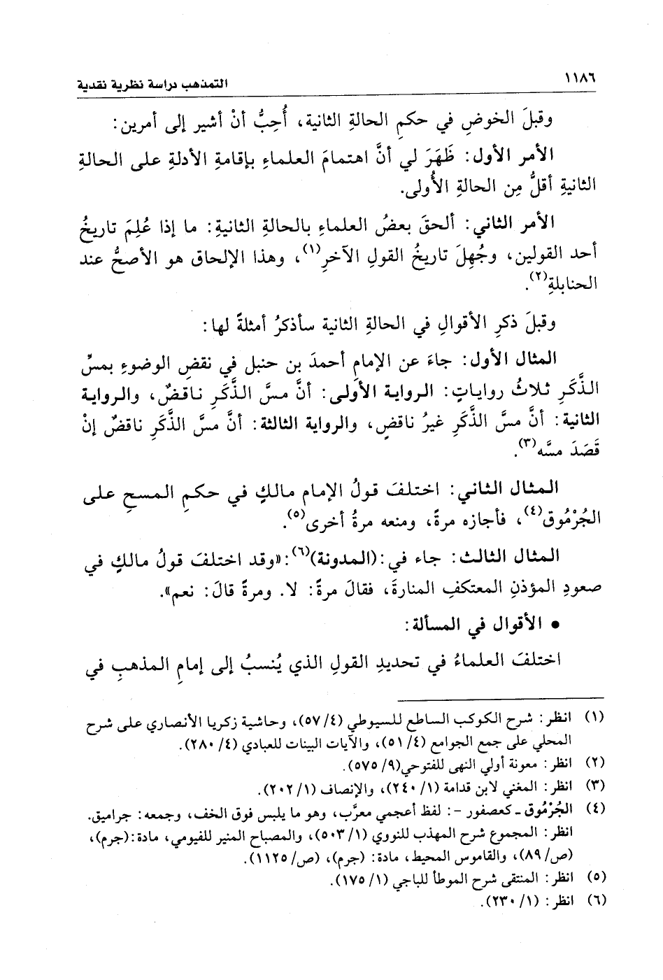 المثال الأول: جاءَ عن الإمامِ أحمدَ بن حنبل في نقضِ الوضوءِ بمسِّ الذَّكَرِ ثلاثُ رواياتِ: الرواية الأولى: أنَّ مسَّ الذَّكَرِ ناقضٌ، والرواية الثانية: أنَّ مسَّ الذَّكَرِ غيرُ ناقضٍ، والرواية الثالثة: أنَّ مسَّ الذَّكَرِ ناقضٌ إنْ قَصدَ مسَّه (¬٣).
