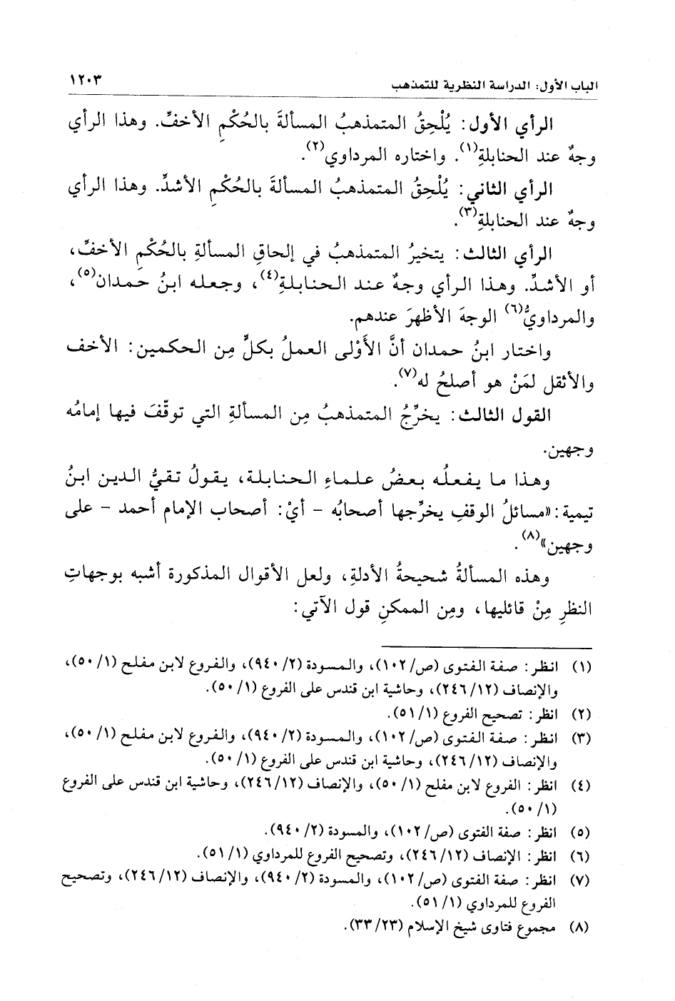 الرأي الثالث: يتخيرُ المتمذهبُ في إلحاقِ المسألةِ بالحُكمِ الأخفِّ، أو الأشدِّ. وهذا الرأي وجهٌ عند الحنابلةِ (¬٤)، وجعله ابنُ حمدان (¬٥)، والمرداويُّ (¬٦) الوجهَ الأظهرَ عندهم.