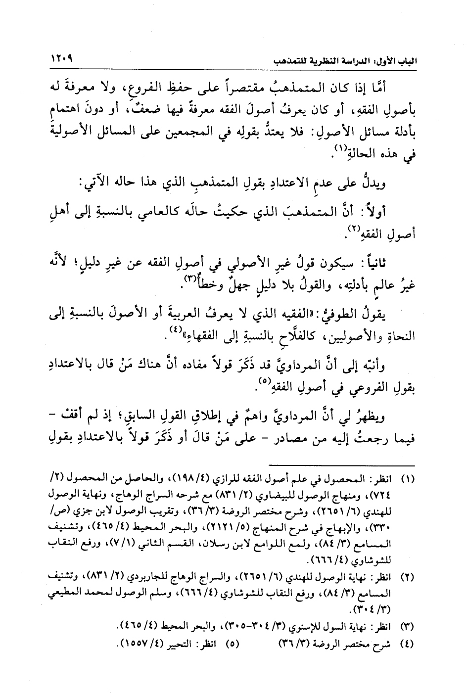 أمَّا إذا كان المتمذهبُ مقتصرًا على حفظِ الفروعِ، ولا معرفةَ له بأصولِ الفقهِ، أو كان يعرفُ أصولَ الفقه معرفةً فيها ضعفٌ، أو دونَ اهتمامِ بأدلة مسائل الأصولِ: فلا يعتدُّ بقولِه في المجمعين على المسائل الأصولية في هذه الحالةِ (¬١).
