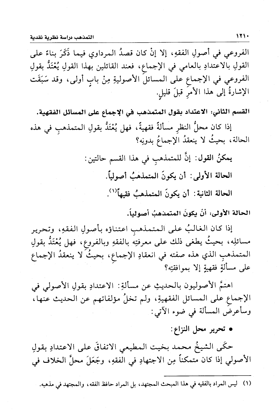 إذا كان الغالبُ على المتمذهبِ اعتناؤه بأصولِ الفقهِ، وتحرير مسائلِه، بحيثُ يطغى ذلك على معرفتِه بالفقهِ وبالفروعِ، فهل يُعْتَدُّ بقولِ المتمذهب الذي هذه صفته في انعقادِ الإجماعِ، بحيثُ لا ينعقدُ الإجماع على مسألَةٍ فقهيةٍ إلا بموافقتِه؟
