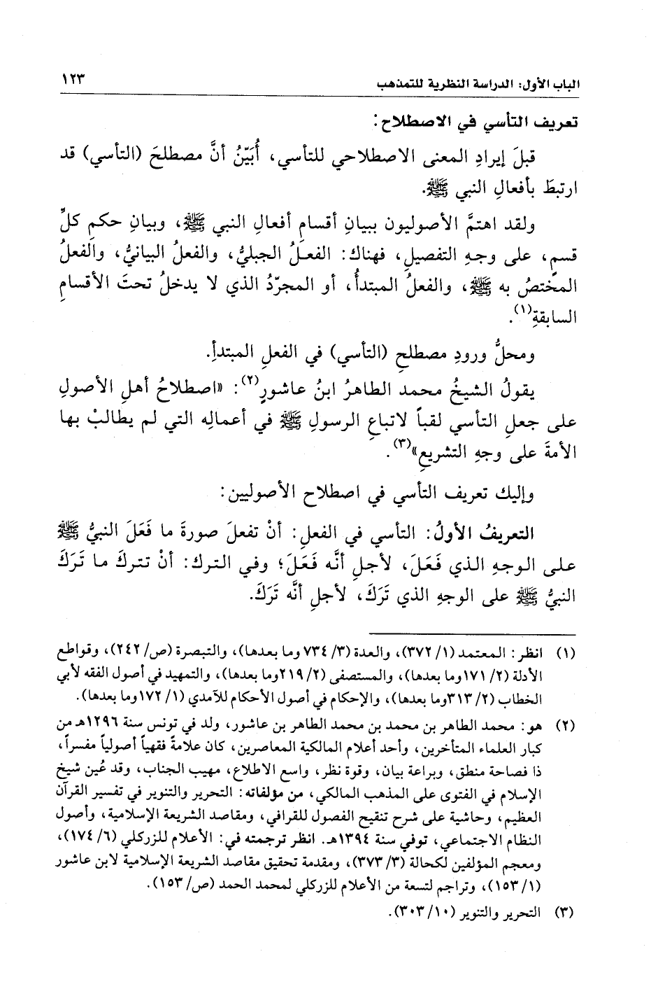 يقولُ الشيخ محمد الطاهرُ بنُ عاشورٍ (¬٢): "اصطلاحُ أهلِ الأصولِ على جعلِ التأسي لقبًا لاتباعِ الرسولِ - صلى الله عليه وسلم - في أعمالِه التي لم يطالبْ بها الأمةَ على وجهِ التشريعِ" (¬٣).