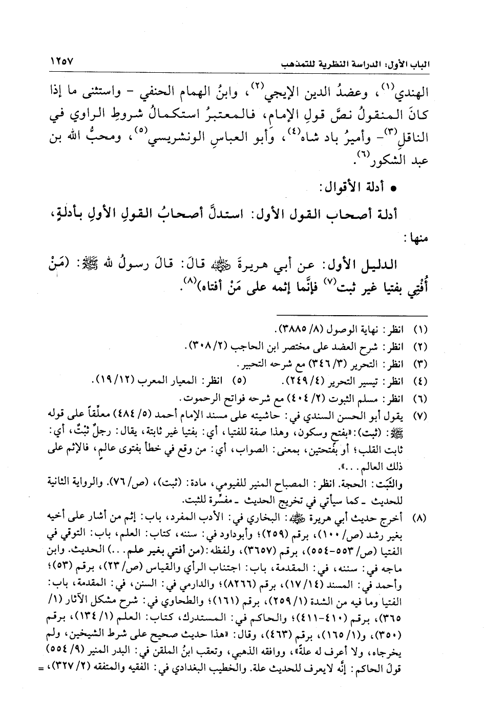 الدليل الأول: عن أبي هريرةَ - رضي الله عنه - قالَ: قالَ رسولُ الله - صلى الله عليه وسلم -: (مَنْ أُفْتِي بفتيا غير ثبت (¬٧) فإنَّما إثمه على مَنْ أفتاه) (¬٨).