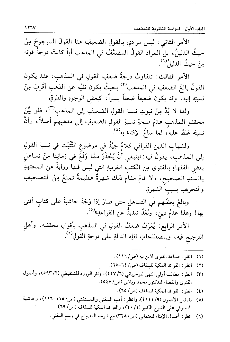 الأمر الرابع: يُعْرَفُ ضعفُ القولِ في المذهب بأقوالِ محققيه، وأهلِ الترجيحِ فيه، وبمصطلحاتِ نقلِه الدالةِ على درجةِ القَولِ (¬٦).