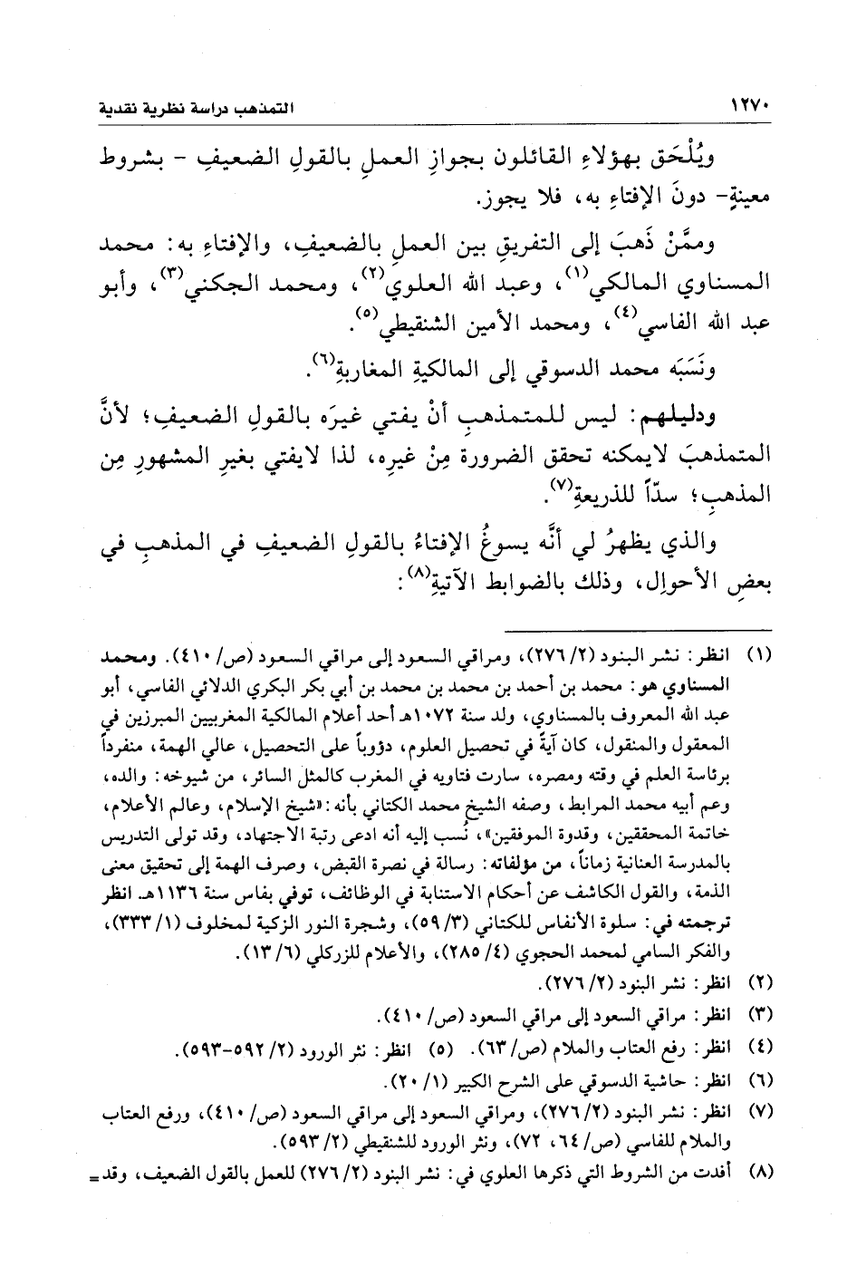 (¬٨) أفدت من الشروط الَّتي ذكرها العلوي في: نشر البنود (٢/ ٢٧٦) للعمل بالقول الضعيف، وقد =