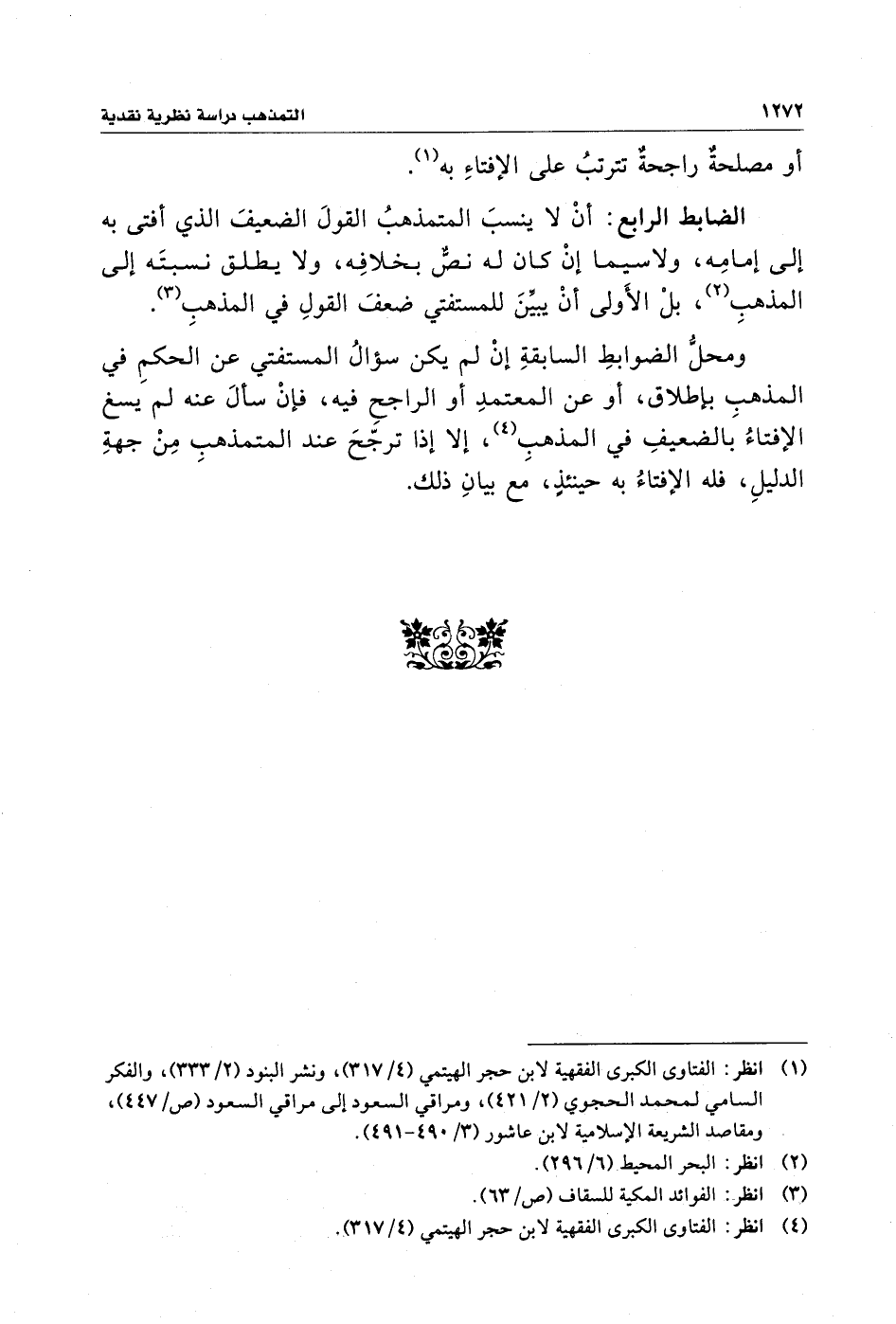 الضابط الرابع: أنْ لا ينسبَ المتمذهبُ القولَ الضعيفَ الَّذي أفتى به إِلى إِمامِه، ولا سيما إِنْ كان له نصٌّ بخلافِه، ولا يطلق نسبتَه إِلى المذهبِ (¬٢)، بلْ الأَولى أنْ يبيِّنَ للمستفتي ضعفَ القولِ في المذهبِ (¬٣).