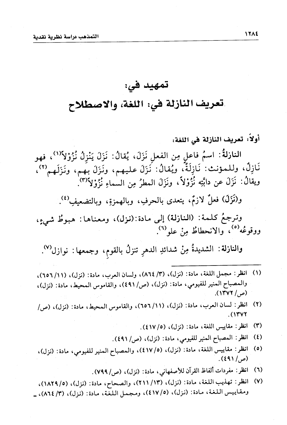 (¬١) انظر: مجمل اللغة، مادة: (نزل)، (٣/ ٨٦٤)، ولسان العرب، مادة: (نزل)، (١١/ ٦٥٦)، والمصباح المنير للفيومي، مادة: (نزل)، (ص/ ٤٩١)، والقاموس المحيط، مادة: (نزل)، (ص/ ١٣٧٢).