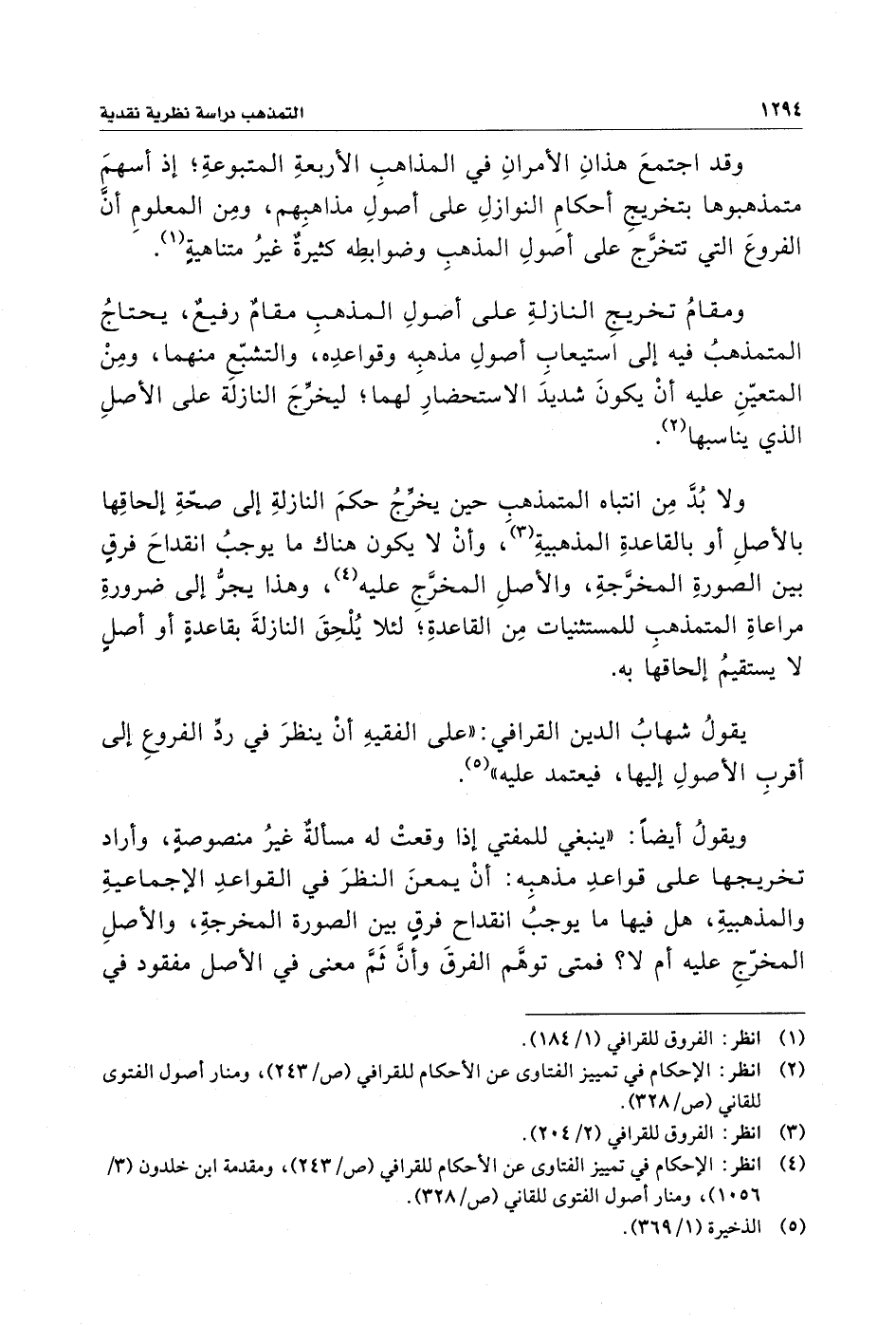 ومقامُ تخريجِ النازلةِ على أصولِ المذهبِ مقامٌ رفيعٌ، يحتاجُ المتمذهبُ فيه إِلى استيعابِ أصولِ مذهبِه وقواعدِه، والتشبّعِ منهما، ومِنْ المتعيّنِ عليه أنْ يكونَ شديدَ الاستحضارِ لهما؛ ليخرِّجَ النازلة على الأصلِ الَّذي يناسبها (¬٢).