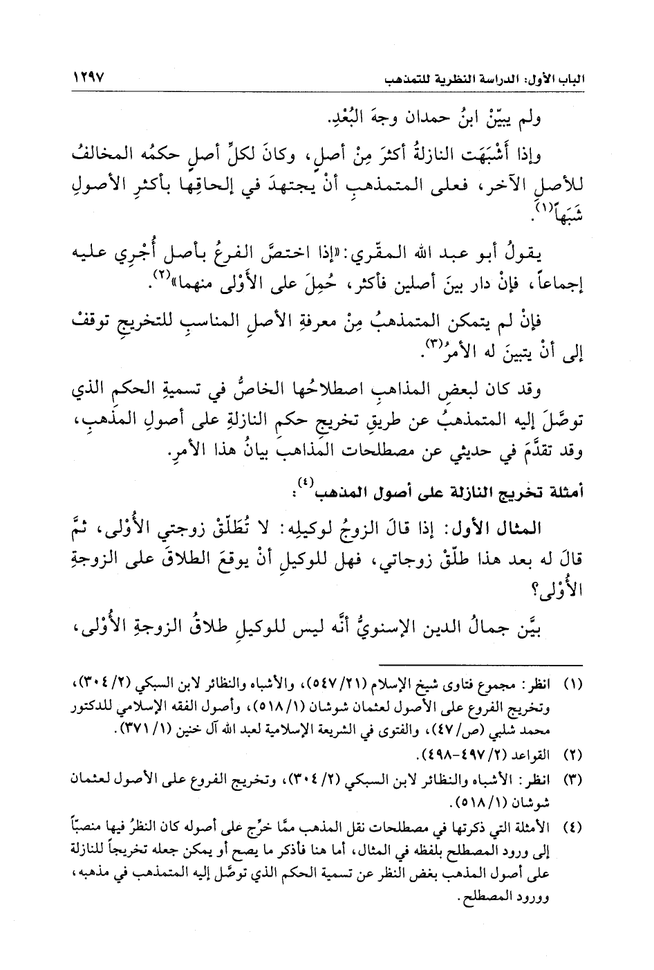 (¬٤) الأمثلة الَّتي ذكرتها في مصطلحات نقل المذهب ممَّا خرِّج على أصوله كان النظرُ فيها منصبًّا إِلى ورود المصطلح بلفظه في المثال، أمَّا هنا فأذكر ما يصح أو يمكن جعله تخريجًا للنازلة على أصول المذهب بغض النظر عن تسمية الحكم الَّذي توصَّل إِليه المتمذهب في مذهبه، وورود المصطلح.