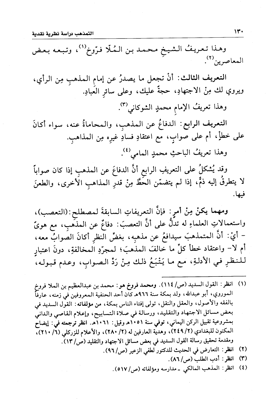 (¬١) انظر: القول السديد (ص/ ١١٤). ومحمد فروخ هو: محمد بن عبد العظيم بن الملا فروخ الموروي، أبو عبد الله، ولد بمكة سنة ٩٦٦ هـ كان أحد الحنفية المعروفين في زمنه، عارفًا بالفقه والأصول، والعقل والنقل، تولى إفتاء الناس بمكة، من مؤلفاته: القول السديد في بعض مسائل الاجتهاد والتقليد، ورسالة في صلاة التسابيح، وإعلام القاصي والداني بمشروعية تقبيل الركن اليماني، توفي سنة ١٠٥١ هـ وقيل: ١٠٦١ هـ. انظر ترجمته في: إيضاح المكنون للبغدادي (٢/ ٢٤٩)، وهدية العارفين له (٢/ ٢٨٠)، والأعلام للزركلي (٦/ ٢١٠)، ومقدمة تحقيق رسالة القول السديد في بعض مسائل الاجتهاد والتقليد (ص/ ١٣).