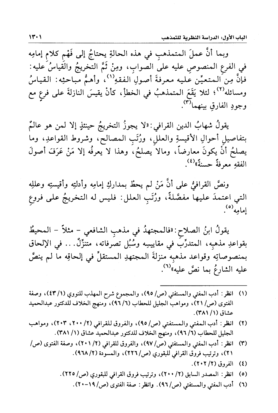 ونصَّ القرافيُّ على أن مَنْ لم يحطْ بمداركِ إِمامِه وأدلتِه وأقيستِه وعللِه الَّتي اعتمدَ عليها مفصَّلةً، ورُتَبِ العلل: فليس له التخريجُ على فروعِ إِمامِه (¬٥).
