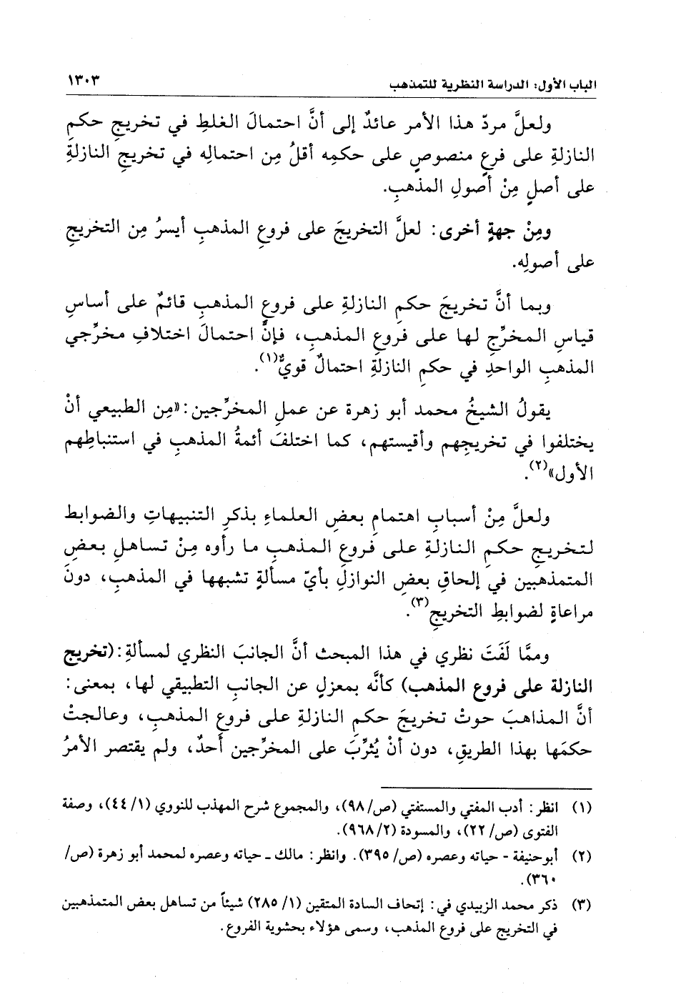 وممَّا لَفَتَ نظري في هذا المبحث أنَّ الجانبَ النظري لمسألةِ: (تخريج النازلة على فروع المذهب) كأنَّه بمعزلٍ عن الجانبِ التطبيقي لها، بمعنى: أنَّ المذاهبَ حوتْ تخريجَ حكمِ النازلةِ على فروع المذهب، وعالجتْ حكمَها بهذا الطريقِ، دون أنْ يُثرِّبَ على المخرِّجين أَحدٌ، ولمَ يقتصر الأمرُ