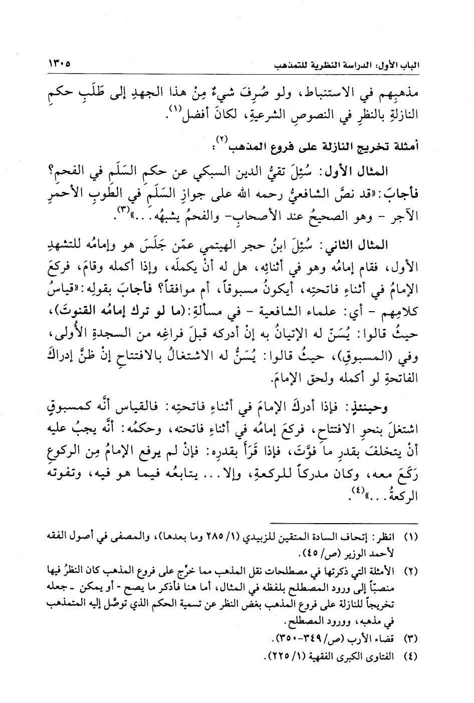 مذهبِهم في الاستنباط، ولو صُرِفَ شيءٌ مِنْ هذا الجهدِ إِلى طَلَبِ حكمِ النازلةِ بالنظرِ في النصوصِ الشرعيةِ، لكانَ أفضل (¬١).