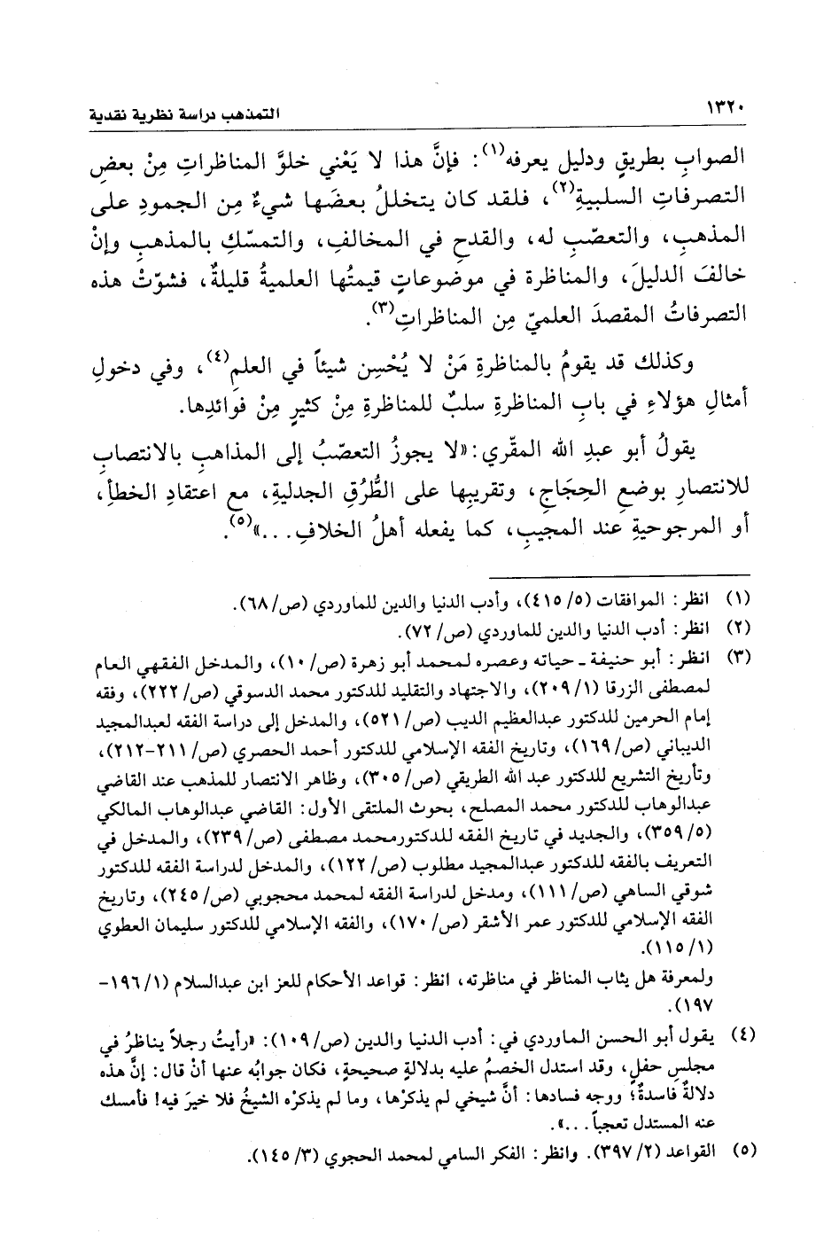 الصوابِ بطريقِ ودليل يعرفه (¬١): فإِنَّ هذا لا يَعْني خلوَّ المناظراتِ مِنْ بعضِ التصرفاتِ السلبيةِ (¬٢)، فلقد كان يتخلل بعضَها شيءٌ مِن الجمودِ على المذهبِ، والتعصّب له، والقدحِ في المخالفِ، والتمسّكِ بالمذهبِ وإِنْ خالفَ الدليلَ، والمَناظرة في موضوعاتِ قيمتها العلميةُ قليلةٌ، فشوّتْ هذه التصرفاتُ المقصدَ العلميّ مِن المناظراتِ (¬٣).