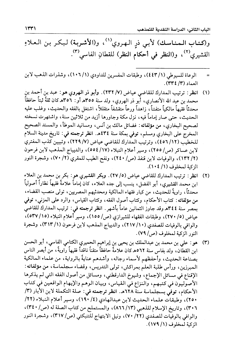 (¬٢) انظر: ترتيب المدارك للقاضي عياض (٥/ ٢٧). وبكر القشيري هو: بكر بن محمد بن العلاء بن محمد القشيري، أبو الفضل، ينسب إلى جده العلاء، كان إمامًا علامة فقيهًا نظارًا أصوليًا محدثًا، راويةً للحديث، من كبار فقهاء المالكية ومحدثيهم المصريين، تولى منصب القضاء، من مؤلفاته: كتاب الأحكام، وكتاب أصول الفقه، وكتاب القياس، والرد على المزني، توفي بمصر سنة ٣٤٤ هـ وقد جاوز الثمانين عامًا بأشهر. انظر ترجمته في: ترتيب المدارك للقاضي عياض (٥/ ٢٧٠)، وطبقات الفقهاء للشيرازي (ص/ ١٥٥)، وسير أعلام النبلاء (١٥/ ٥٣٧)، والوافي بالوفيات للصفدي (١٠/ ٢١٧)، والديباج المذهب لابن فرحون (١/ ٣١٣)، وشجرة النور الزكية لمخلوف (ص/ ٧٩).