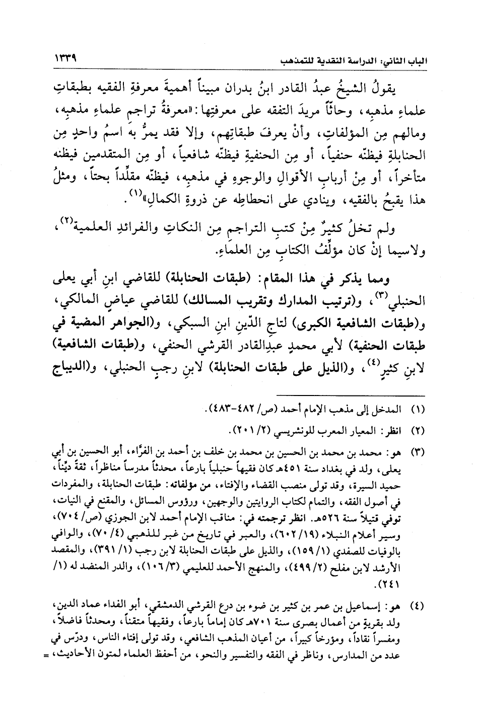 يقولُ الشيخُ عبدُ القادر بنُ بدران مبينًا أهميةَ معرفةِ الفقيه بطبقاتِ علماءِ مذهبِه، وحاثًّا مريدَ التفقه على معرفتِها: "معرفةُ تراجمِ علماءِ مذهبِه، وما لهم مِن المؤلفاتِ، وأنْ يعرفَ طبقاتِهم، وإلا فقد يمرُّ به اسمُ واحدٍ مِن الحنابلةِ فيظنّه حنفيًا، أو مِن الحنفيةِ فيظنّه شافعيًا، أو مِن المتقدمين فيظنه متأخرًا، أو مِنْ أربابِ الأقوالِ والوجوهِ في مذهبِه، فيظنّه مقلِّدًا بحتًا، ومثلُ هذا يقبحُ بالفقيه، وينادي على انحطاطِه عن ذروةِ الكمالِ" (¬١).