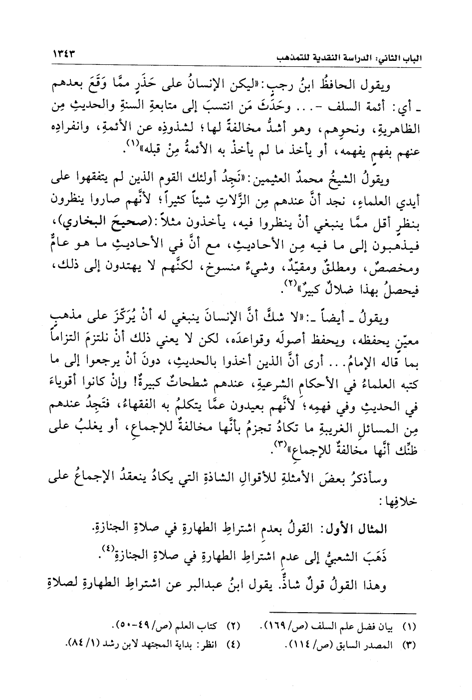 ويقولُ - أيضًا -: "لا شكَّ أنَّ الإنسانَ ينبغي له أنْ يُرَكّزَ على مذهبٍ معيّنٍ يحفظه، ويحفظ أصولَه وقواعدَه، لكن لا يعني ذلك أنْ نلتزمَ التزامًا بما قاله الإمامُ ... أرى أنَّ الذين أخذوا بالحديثِ، دونَ أنْ يرجعوا إلى ما كتبه العلماءُ في الأحكامِ الشرعيةِ، عندهم شطحاتٌ كبيرةٌ! وإنْ كانوا أقوياءَ في الحديثِ وفي فهمِه؛ لأنَّهم بعيدون عمَّا يتكلمُ به الفقهاءُ، فتَجِدُ عندهم مِن المسائلِ الغريبةِ ما تكادُ تجزمُ بأنَّها مخالفةٌ للإجماعِ، أو يغلبُ على ظنِّك أنَّها مخالفةٌ للإجماعِ" (¬٣).