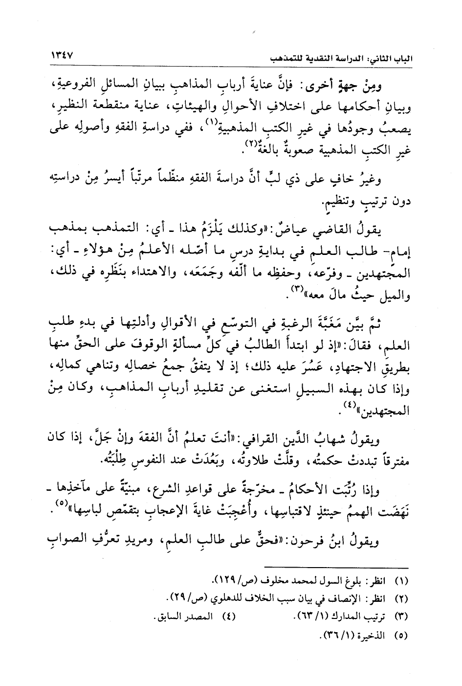 ومِنْ جهةٍ أخرى: فإنَّ عنايةَ أربابِ المذاهبِ ببيانِ المسائلِ الفروعيةِ، وبيانِ أحكامها على اختلافِ الأحوالَ والهيئاتِ، عناية منقطعة النظيرِ، يصعبُ وجودُها في غيرِ الكتبِ المذهبيةِ (¬١)، ففي دراسةِ الفقهِ وأصولِه على غيرِ الكتبِ المذهبية صعوبةٌ بالغةٌ (¬٢).
