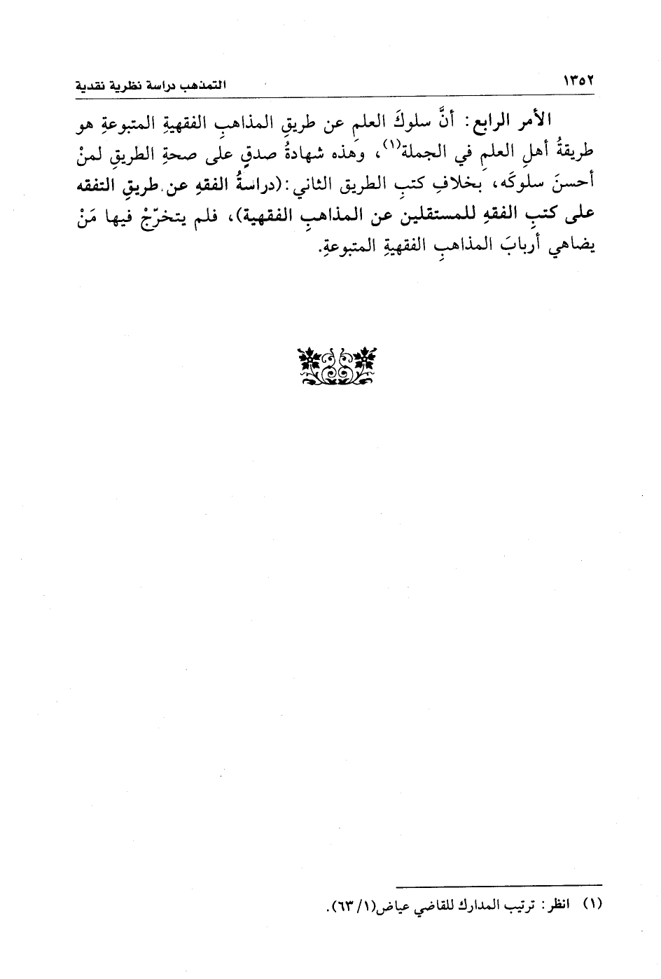 الأمر الرابع: أنَّ سلوكَ العلمِ عن طريقِ المذاهب الفقهيةِ المتبوعةِ هو طريقةُ أهلِ العلمِ في الجملة (¬١)، وهذه شهادةُ صدقٍ علَى صحةِ الطريقِ لمنْ أحسنَ سلوكَه، بخلافِ كتب الطريق الثاني: (دراسة الفقهِ عن طريقِ التفقه على كتبِ الفقهِ للمستقلينَ عن المذاهبِ الفقهية)، فلم يتخرّجْ فيها مَنْ يضاهي أربابَ المذاهبِ الفقهيةِ المتبوعةِ.