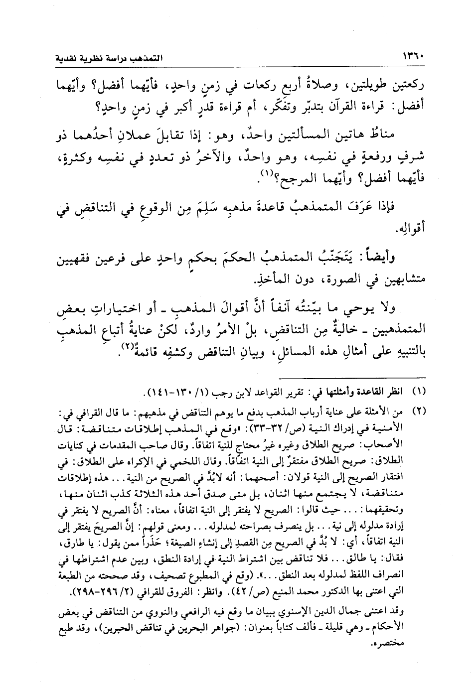 (¬٢) من الأمثلة على عناية أرباب المذهب بدفع ما يوهم التناقض في مذهبهم: ما قال القرافي في: الأمنية في إدراك النية (ص/ ٣٢ - ٣٣): "وقع في المذهب إطلاقات متناقضة: قال الأصحاب: صريح الطلاق وغيره غيرُ محتاجٍ للنية اتفاقًا. وقال صاحب المقدمات في كنايات الطلاق: صريح الطلاق مفتقرٌ إلى النية اتفاقًا. وقال اللخمي في الإكراه على الطلاق: في افتقار الصريح إلى النية قولان: أصحهما: أنَّه لابُدَّ في الصريح من النية ... هذه إطلاقات متناقضة، لا يجتمع منها اثنان، بل متى صدق أحد هذه الثلاثة كذب اثنان منها، وتحقيقهما: ... حيث قالوا: الصريح لا يفتقر إلى النية اتفاقًا، معناه: أنَّ الصريح لا يفتقر في إرادة مدلوله إلى نية ... بل ينصرف بصراحته لمدلوله ... ومعنى قولهم: إنَّ الصريحَ يفتقر إلى النية اتفاقًا، أي: لا بُدَّ في الصريح مِن القصدِ إلى إنشاءِ الصيغة؛ حَذرًا ممن يقول: يا طارق، فقال: يا طالق ... فلا تناقض بين اشتراط النية في إرادة النطق، وبين عدم اشتراطها في انصراف اللفظ لمدلوله بعد النطق ... ". (وقع في المطبوع تصحيف، وقد صححته من الطبعة التي اعتنى بها الدكتور محمد المنيع (ص/ ٤٢). وانظر: الفروق للقرافي (٢/ ٢٩٦ - ٢٩٨).