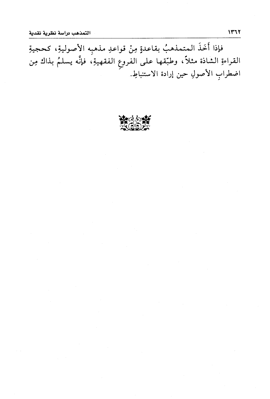 فإذا أَخَذَ المتمذهبُ بقاعدةِ مِنْ قواعدِ مذهبِه الأصوليةِ، كحجيةِ القراءةِ الشاذة مثلًا، وطبّقها على الفروعِ الفقهيةِ، فأنَّه يسلمُ بذاك مِن اضطرابِ الأصولِ حين إرادة الاستنباطِ.