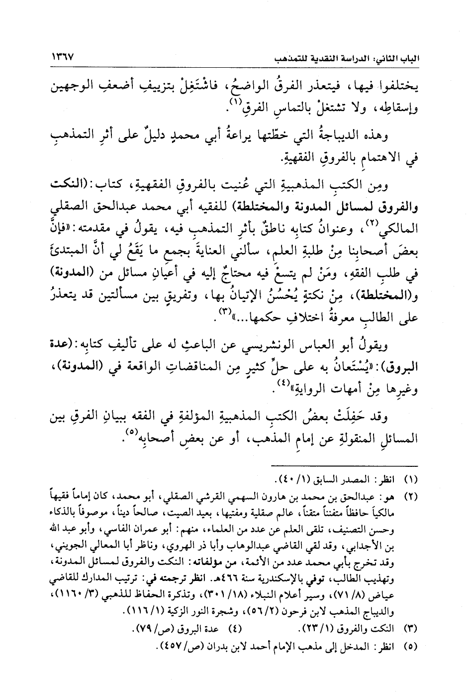 ومِن الكتب المذهبيةِ التي عُنيت بالفروقِ الفقهيةِ، كتاب: (النكت والفروق لمسائلَ المدونة والمختلطة) للفقيه أبي محمد عبد الحق الصقلي المالكي (¬٢)، وعنوانُ كتابِه ناطقٌ بأثرِ التمذهبِ فيه، يقولُ في مقدمته: "فإنَّ بعضَ أصحابِنا مِنْ طلبةِ العلمِ، سألني العنايةَ بجمعِ ما يَقَعُ لي أنَّ المبتدئَ في طلبِ الفقهِ، ومَنْ لم يتسعْ فيه محتاجٌ إليه في أعيانِ مسائل من (المدونة) و (المختَلطة)، مِنْ نكتةٍ يُحْسُنُ الإتيانُ بها، وتفريقٍ بين مسألتين قد يتعذرُ على الطالبِ معرفةُ اختلافِ حكمها ... " (¬٣).