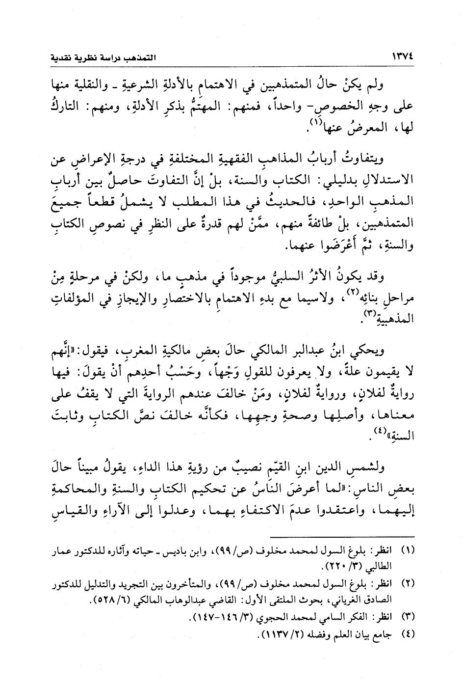 ولم يكنْ حالُ المتمذهبين في الاهتمامِ بالأدلةِ الشرعيةِ - والنقلية منها على وجهِ الخصوص - واحدًا، فمنهم؛ المهتمُّ بذكرِ الأدلةِ، ومنهم: التاركُ لها، المعرضُ عنها (¬١).