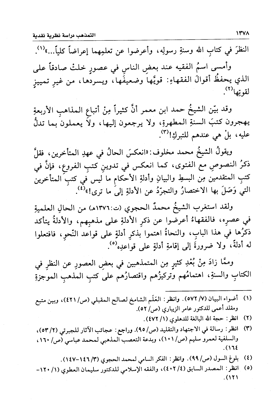ويقولُ الشيخُ محمد مخلوف: "انعكسَ الحالُ في عهدِ المتأخرين، فقلَّ ذكرُ النصوصِ مع الفتوى، كما انعكس في تدوينِ كتبِ الفروعِ، فإنَّ في كتبِ المتقدمين مِن البسطِ والبيانِ وأدلةِ الأحكامِ ما ليس في كتب المتأخرين التي وَصَلَ بها الاختصارُ والتجرّدُ عن الأدلةِ إلى ما ترى! " (¬٤).