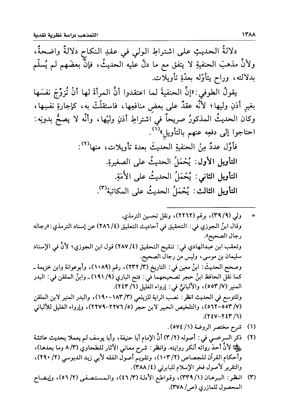 يقولُ الطوفي: "إنَّ الحنفيةَ لما اعتقدوا أنَّ المرأةَ لها أنْ تُزوِّجَ نفسَها بغيرِ أذنِ وليها؛ لأنَّه عقدٌ على بعضِ منافعِها، فاستقلّتْ به، كإجارةِ نفسِها، وكان الحديثُ المذكورُ صريحًا في اشتراطِ أذنِ وليّها، وأنَّه لا يصُّح بدونِه: احتاجوا إلى دفعِه عنهم بالتأويلِ" (¬١).
