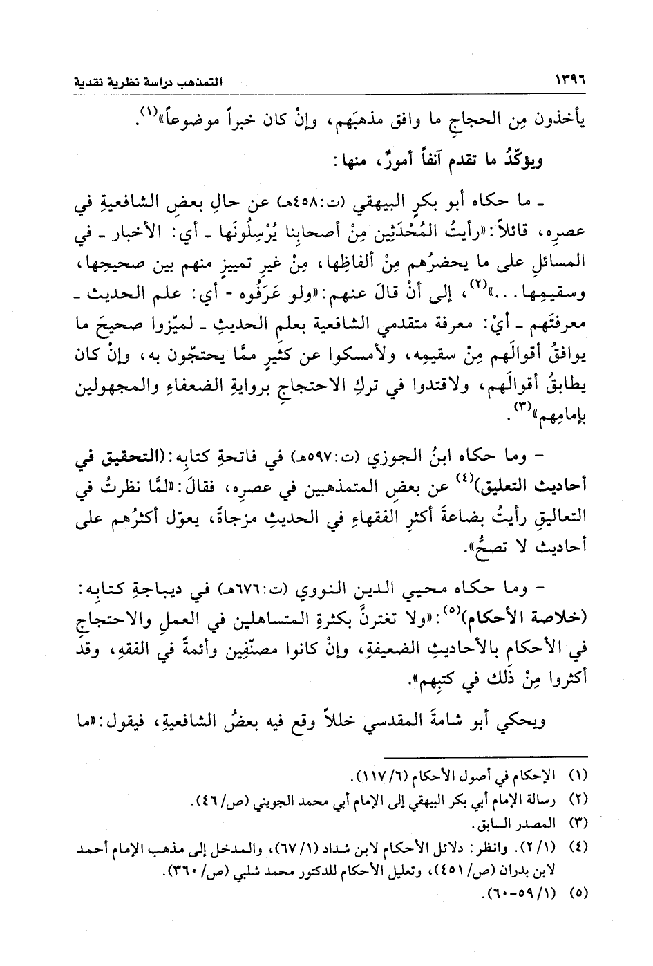 - ما حكاه أبو بكرٍ البيهقي (ت: ٤٥٨ هـ) عن حالِ بعضِ الشافعيةِ في عصرِه، قائلًا: "رأيتُ المُحْدَثِين مِنْ أصحابِنا يُرْسِلُونَها - أي: الأخبار - في المسائلِ على ما يحضرُهم مِنْ ألفاظِها، مِنْ غيرِ تمييزٍ منهم بين صحيحِها، وسقيمِها ... " (¬٢)، إلى أنْ قالَ عنهم: "ولو عَرَفُوه - أي: علم الحديث - معرفتَهم - أيْ: معرفة متقدمي الشافعية بعلمِ الحديثِ - لميّزوا صحيحَ ما يوافقُ أقوالَهم مِنْ سقيمِه، ولأمسكوا عن كثيرٍ ممَّا يحتجّون به، وإنْ كان يطابقُ أقوالَهم، ولاقتدوا في تركِ الاحتجاجِ بروايةِ الضعفاءِ والمجهولين بإمامِهم" (¬٣).